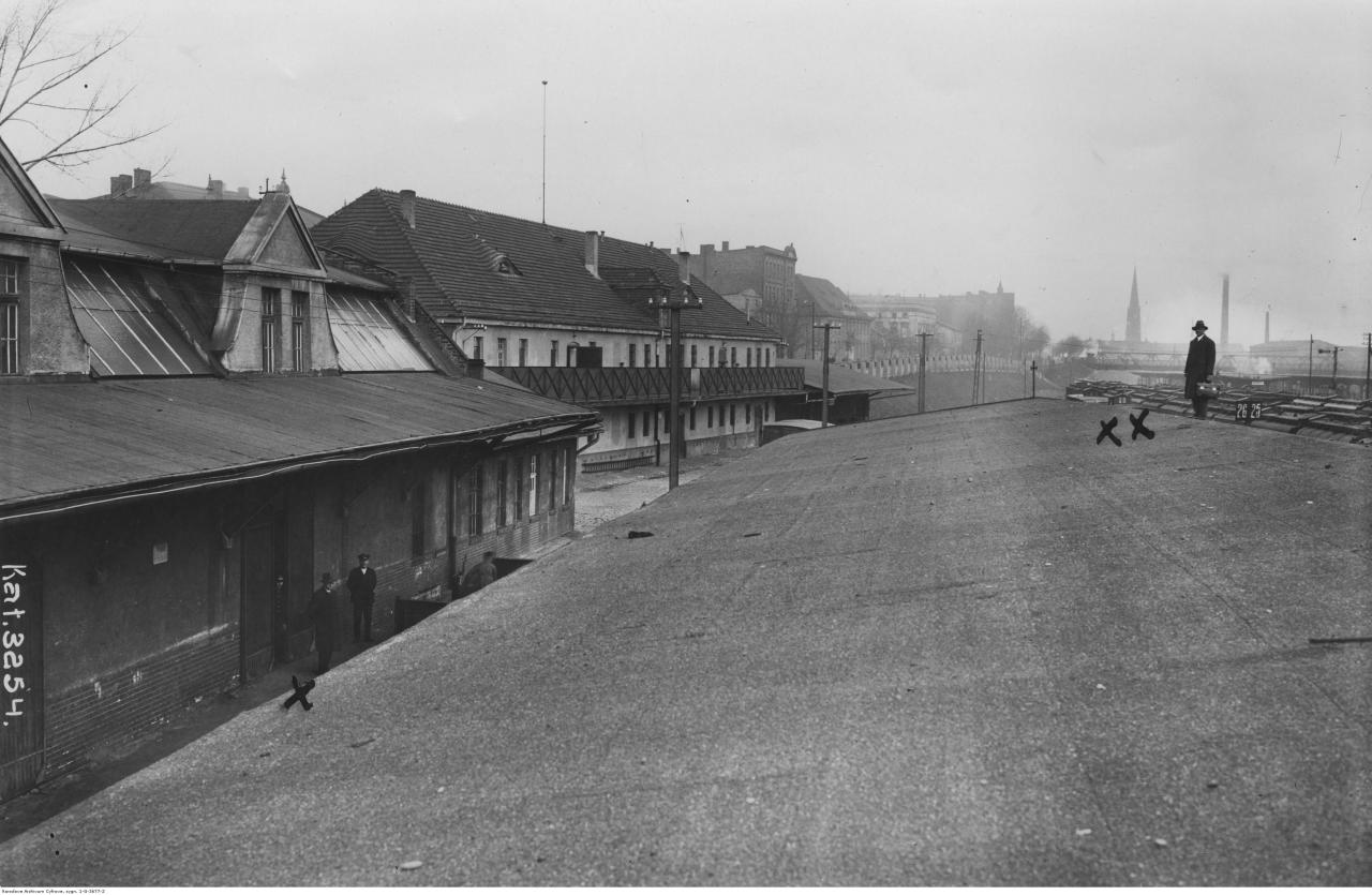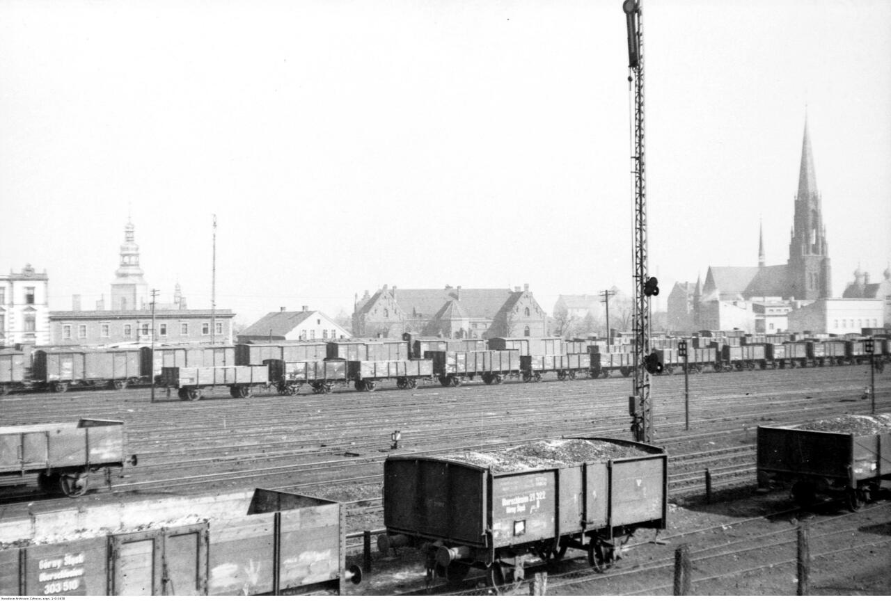 Źródło: Narodowe Archiwum Cyfrowe, sygn. 1-G-3678. W prawo dworzec i perony, w lewo Szabelnia, Stawiska (dalej stacja Katowice, Katowice Janów, Chorzów Stary).