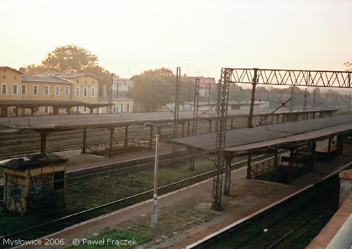 Dworzec w Mysłowicach przed odmalowaniem. Przed nim peron 1. Widok w kierunku północno-wschodnim: w prawo Mysłowice Kosztowy/Oświęcim, Jęzor/Jaworzno Szczakowa, w lewo Szabelnia, Stawiska (dalej stacja Katowice, Katowice Janów, Chorzów Stary).