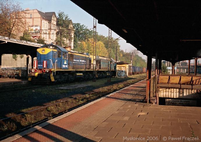 Prywatny pociąg towarowy, jakich mnóstwo przetacza się w ciągu dnia między peronami 2 (z prawej) i 3 (z lewej) mysłowickiej stacji. Pomiędzy torami pozostałości po peronie bagażowym. Widok w kierunku północno-zachodnim: Szabelnia, Stawiska (dalej stacja Katowice, Katowice Janów, Chorzów Stary).