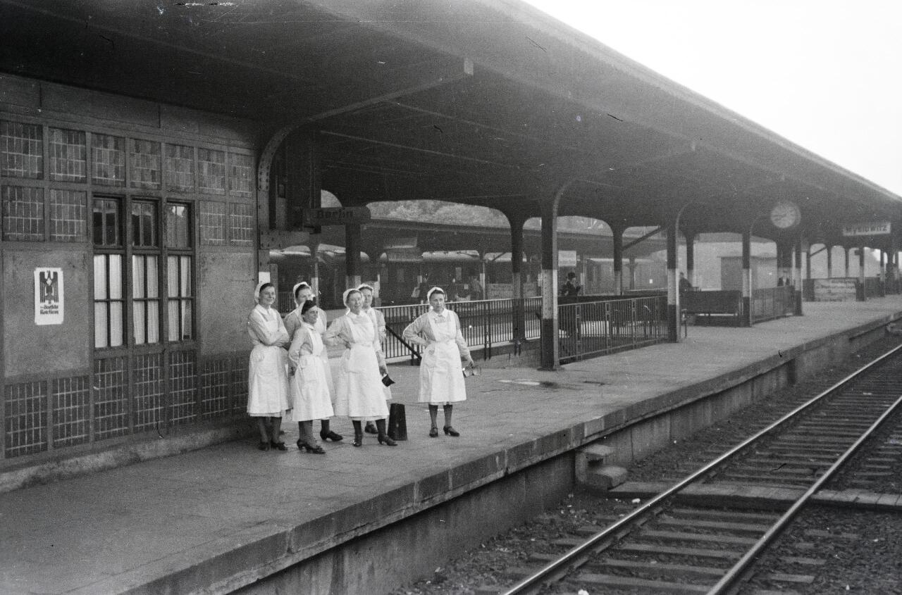 Pielęgniarki z węgierskiego wojskowego pociągu sanitarnego na peronie w Mysłowicach. Peron 2, w tle widoczny peron 3. Widok w kierunku północno-zachodnim: Szabelnia, Stawiska (dalej stacja Katowice, Katowice Janów, Chorzów Stary).