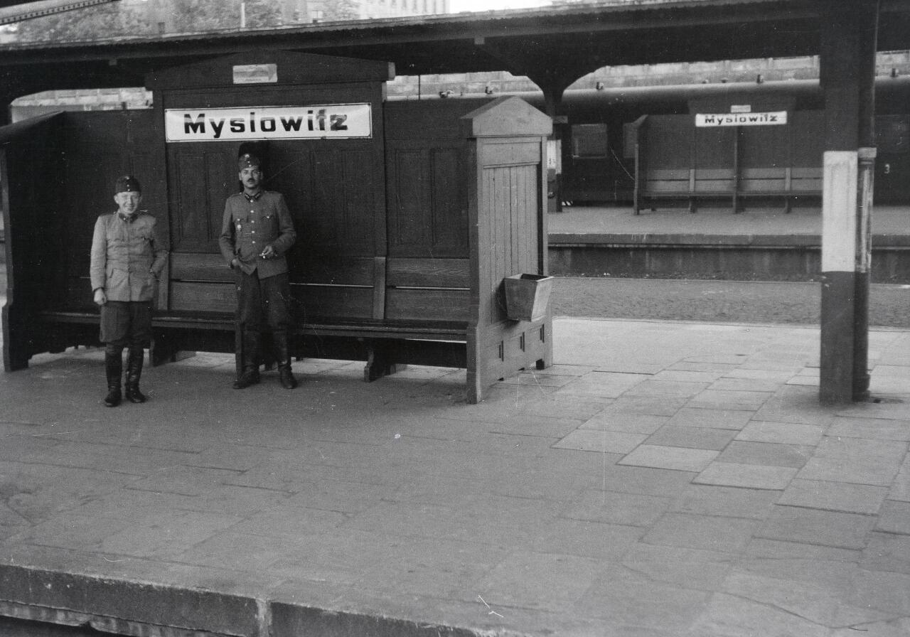 Węgierscy żołnierze na stacji w Mysłowicach. Peron 2, w tle peron 3. Widok w kierunku południowo-zachodnim: w lewo Mysłowice Kosztowy/Oświęcim, Jęzor/Jaworzno Szczakowa, w prawo Szabelnia, Stawiska (dalej stacja Katowice, Katowice Janów, Chorzów Stary).