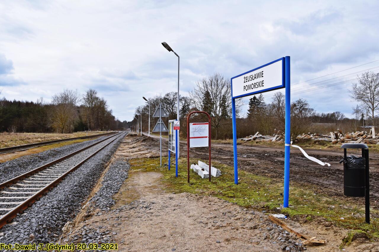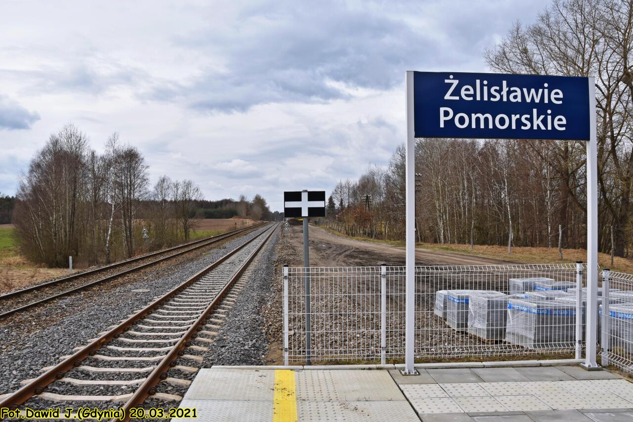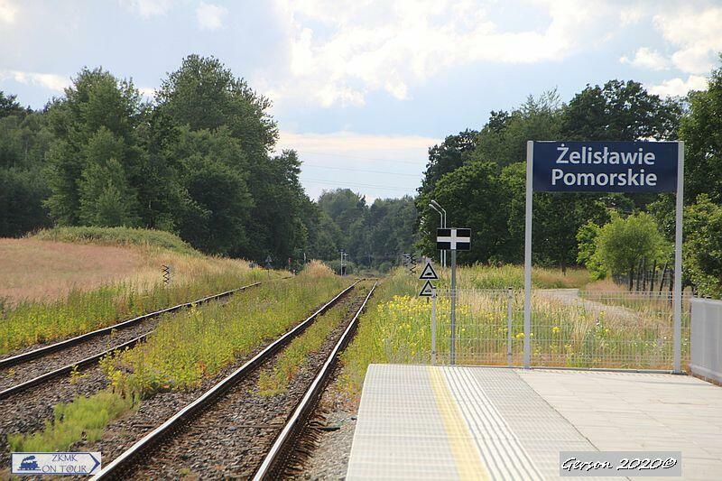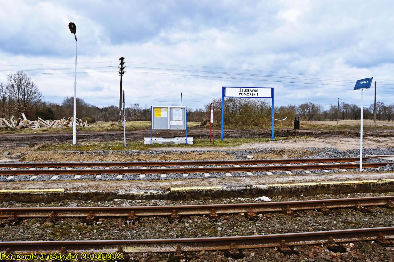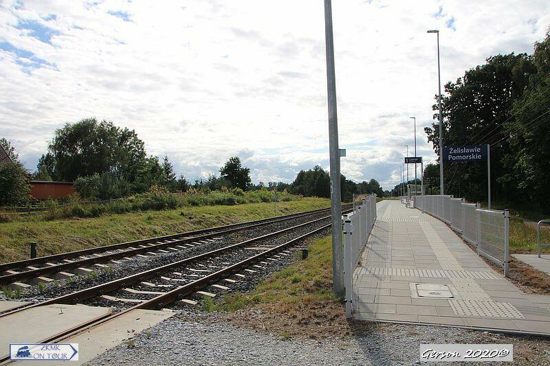 Peron 1 na nowym przystanku w Żelisławie Pomorskim, który obsługuje ruch podróżnych wyłącznie w kierunku Bobrowa Pomorskiego. W tle widać peron 2 znajdujący się w starej lokalizacji, który obsługuje ruch podróżnych wyłącznie w kierunku Czaplinka.