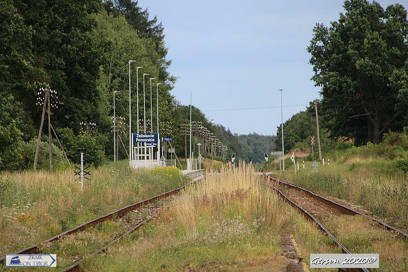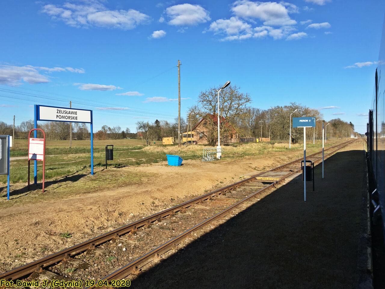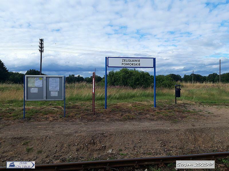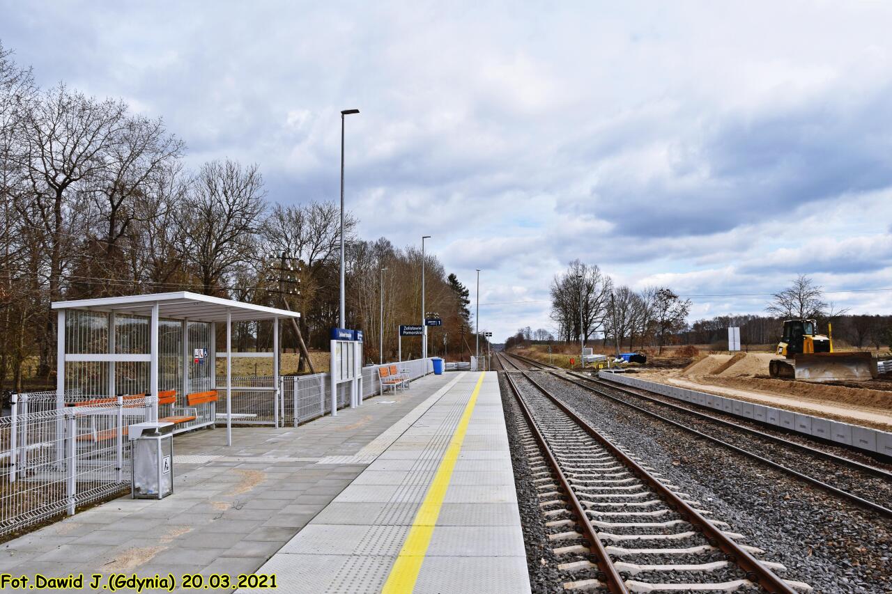 Peron 1 na nowym przystanku w Żelisławie Pomorskim, który obsługuje ruch podróżnych wyłącznie w kierunku Bobrowa Pomorskiego. W tle widać peron 2 znajdujący się w starej lokalizacji, który obsługuje ruch podróżnych wyłącznie w kierunku Czaplinka.