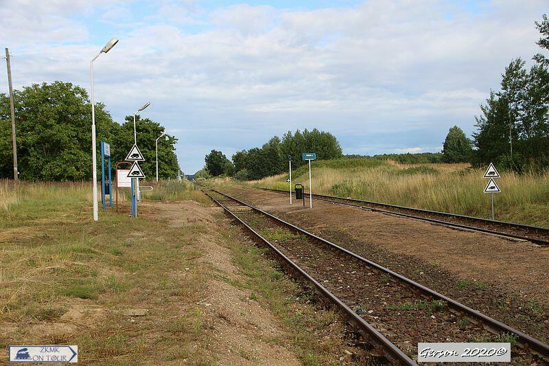 Widok na dawny peron 1, peron 2 (poprzednia lokalizacja). Znajdują się tu: tablice informacyjne, tablica z nazwą przystanku osobowego i śmietnik. W lewo Złocieniec i Runowo Pomorskie, w prawo Czaplinek i Chojnice.