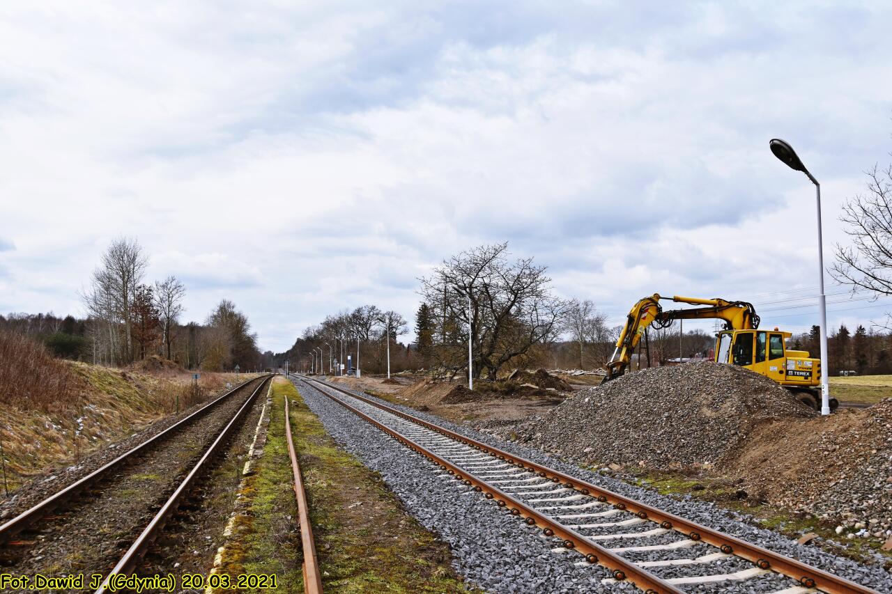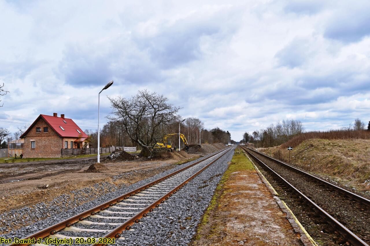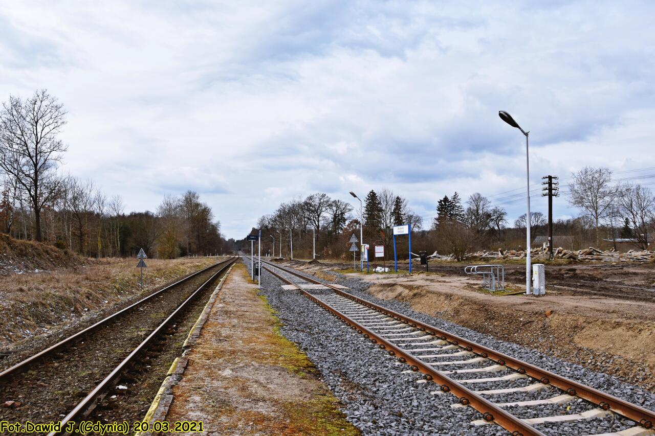 Widok na budowany nowy peron 2, peron 1 oraz w kierunku Złocieńca i Runowa Pomorskiego. Tablica z nazwą przystanku osobowego.