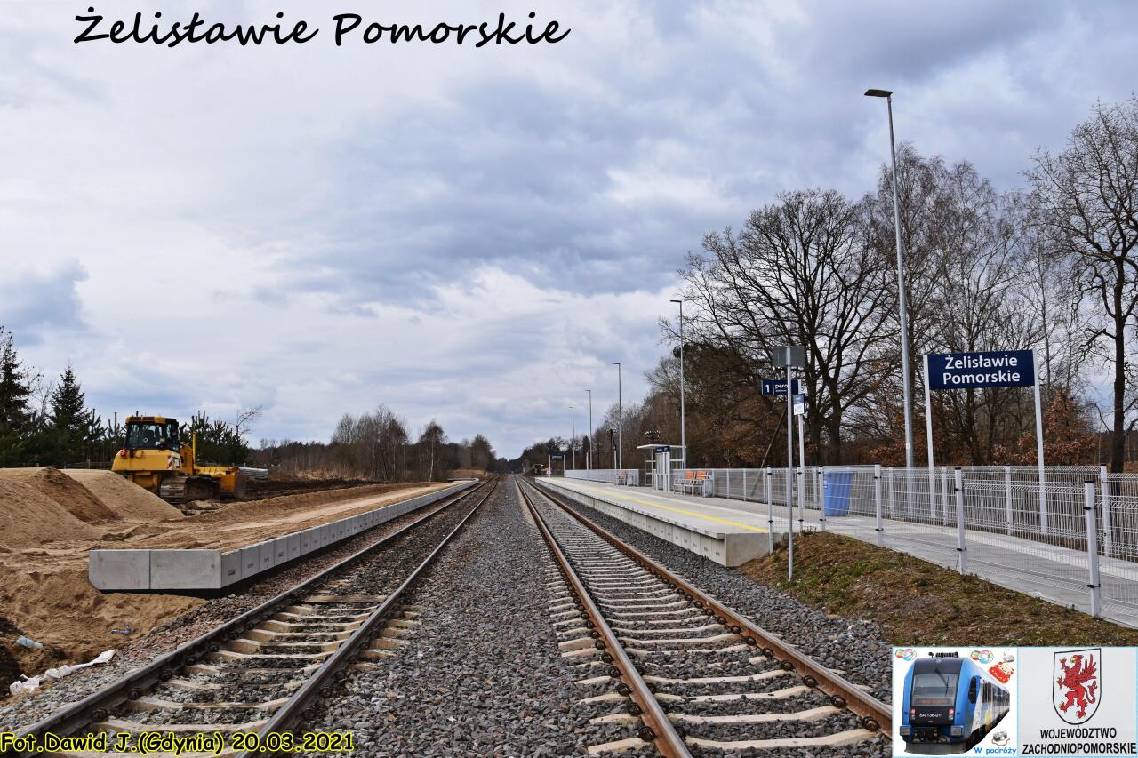 Nowy przystanek(peron 1)w Żelisławie Pomorskim. Uwaga! Obsługuje ruch podróżnych wyłącznie w kierunku Bobrowa Pomorskiego. Ruch w kierunku Czaplinka obsługiwany jest z peronu 2 znajdującego się w starej lokalizacji, w odległości około 400 metrów od tego miejsca. Co ciekawe - brak jakiejkolwiek informacji o tym w gablocie z rozkładem jazdy. Ponadto pierwszy raz spotykam się z rozwiązaniem, w którym funkcjonują jednocześnie dwie lokalizacje stara i nowa. Widok w kierunku starej lokalizacji i dalej Bobrowa Pomorskiego.