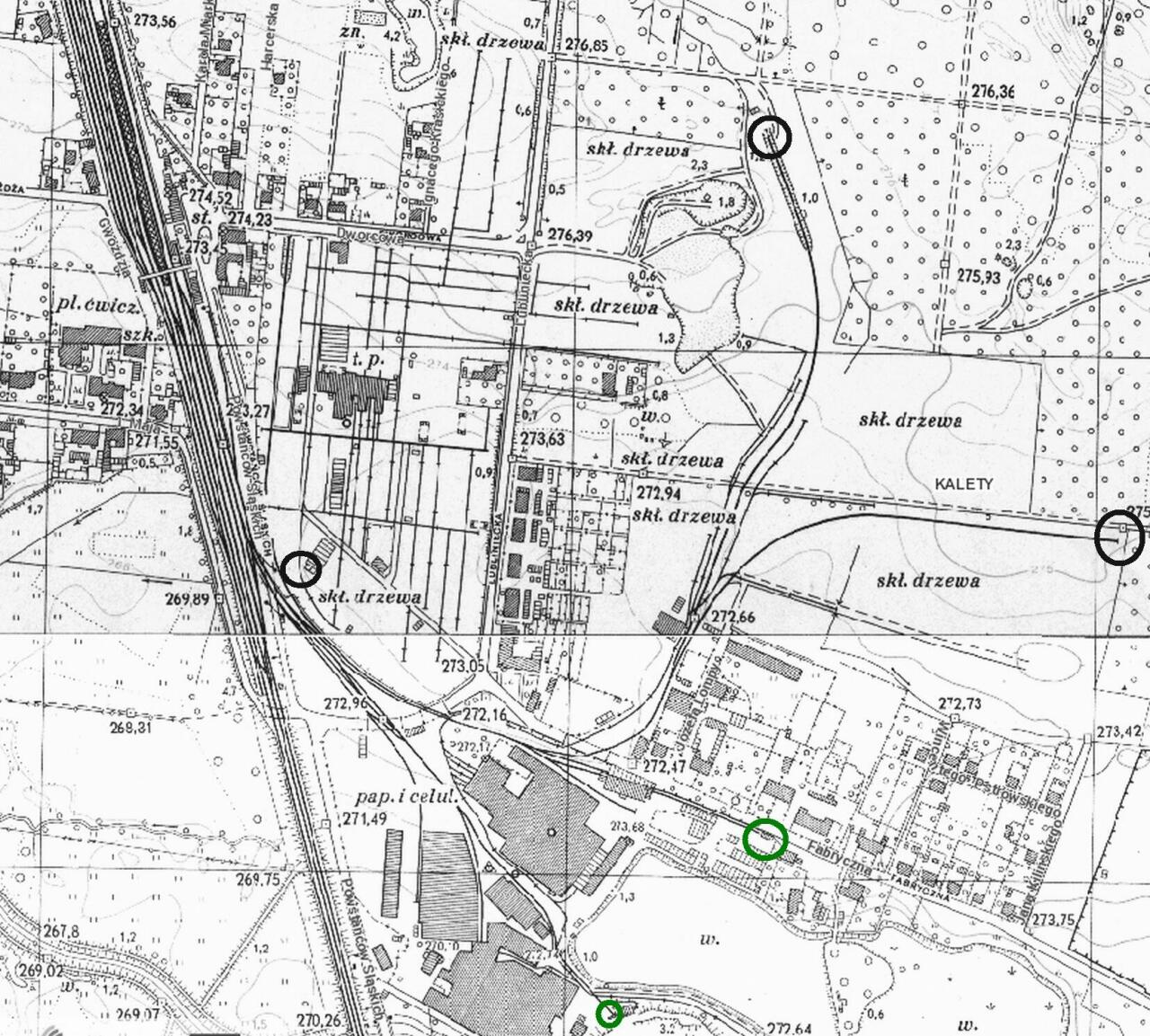 U góry budynek dworca. Pośrodku ulica Dworcowa a na samym dole papiernia.