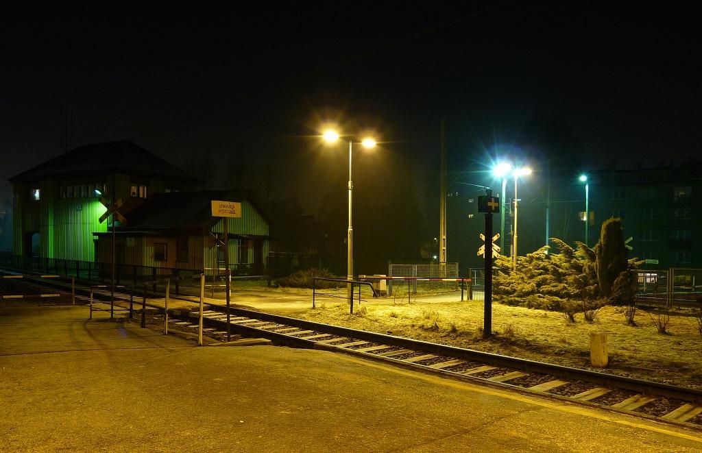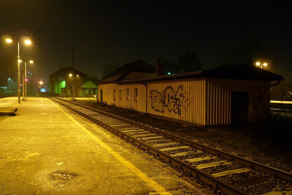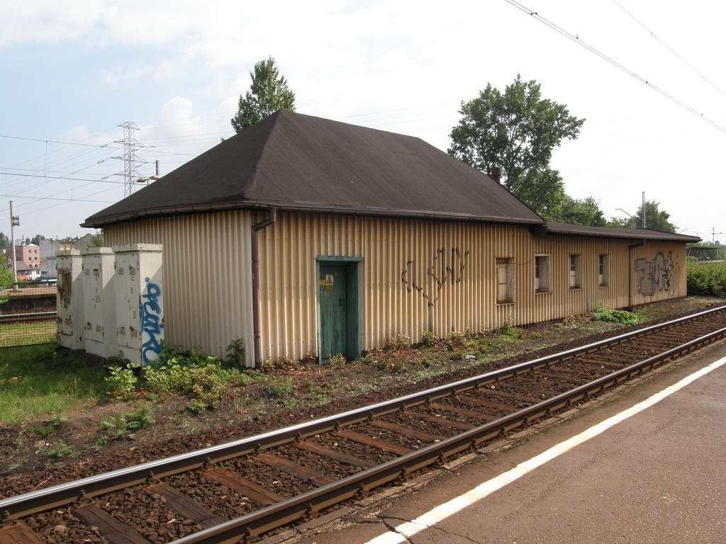 Budynek gospodarczy pomiędzy peronami. Widok w kierunku północno-wschodnim: Mysłowice, Sosnowiec, dawniej Katowice Janów. 315,6 km/ 30,2 km.