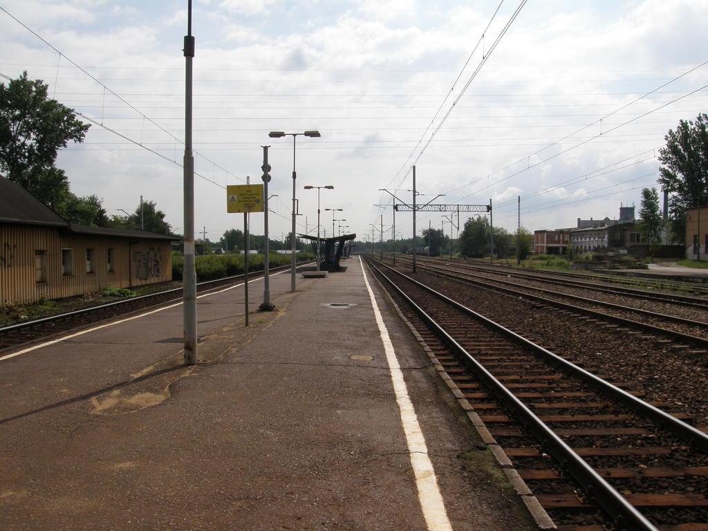 Peron pierwszy, dla linii Sosnowiec - Katowice. Po prawej budynek gospodarczy pomiędzy peronami. Widok w kierunku wschodnim: Mysłowice, Sosnowiec, dawniej Katowice Janów. 315,6 km/ 30,2 km.