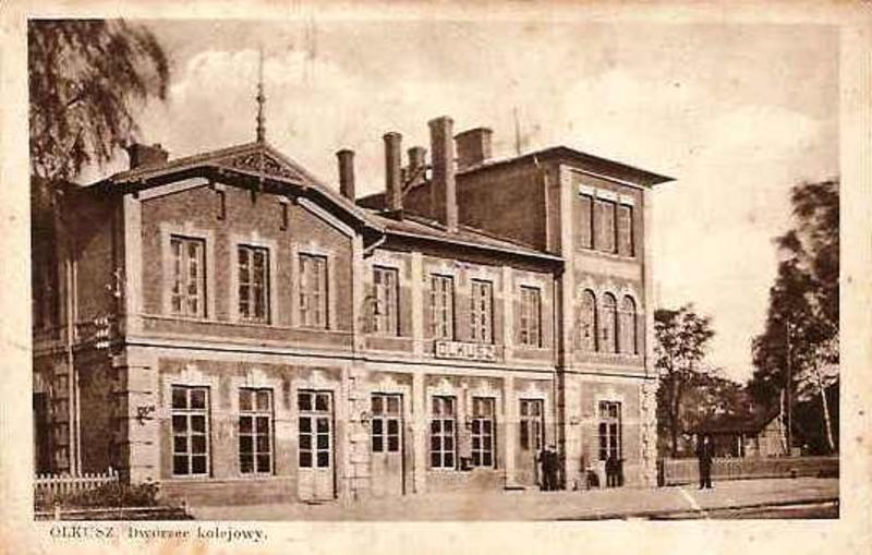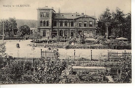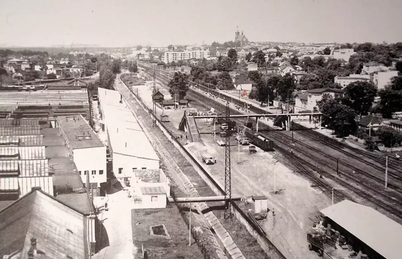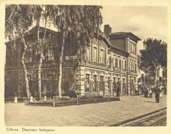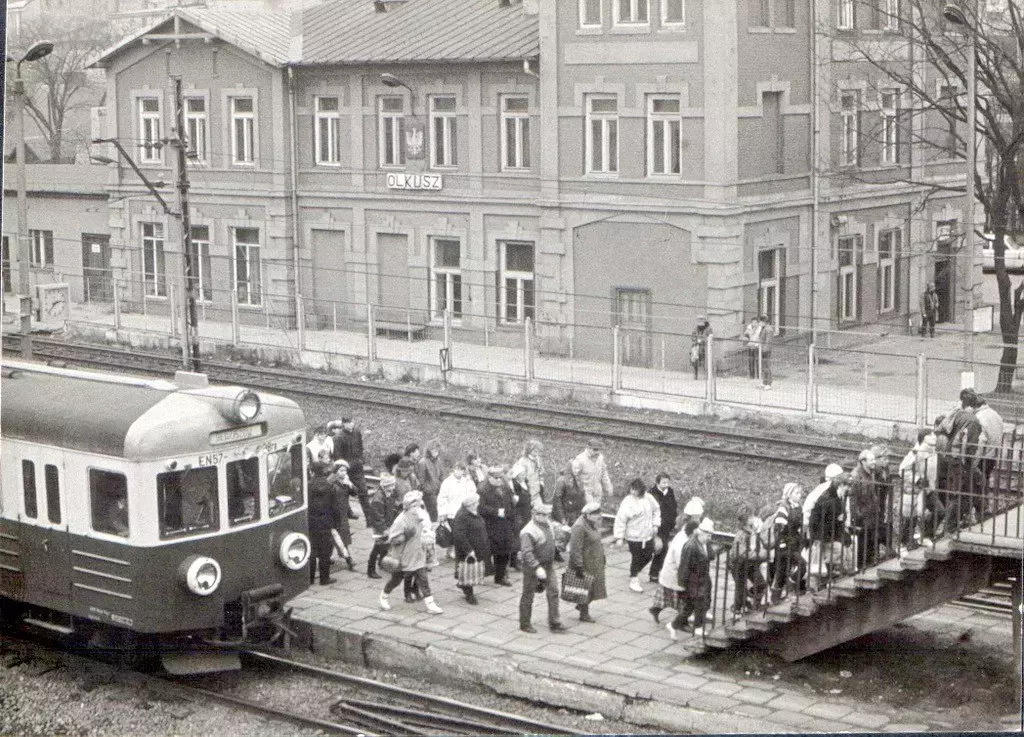 Stacja Olkusz w latach 70. Na zdjęciu widoczny ciekawy jest układ torowiska, jeszcze przed wybudowaniem linii szerokotorowej. W jej miejscu widać odchodzącą bocznicę do rampy.