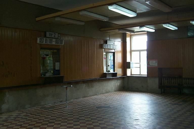 Olkusz, wnętrze budynku stacyjnego, poczekalnia - kasy biletowe.