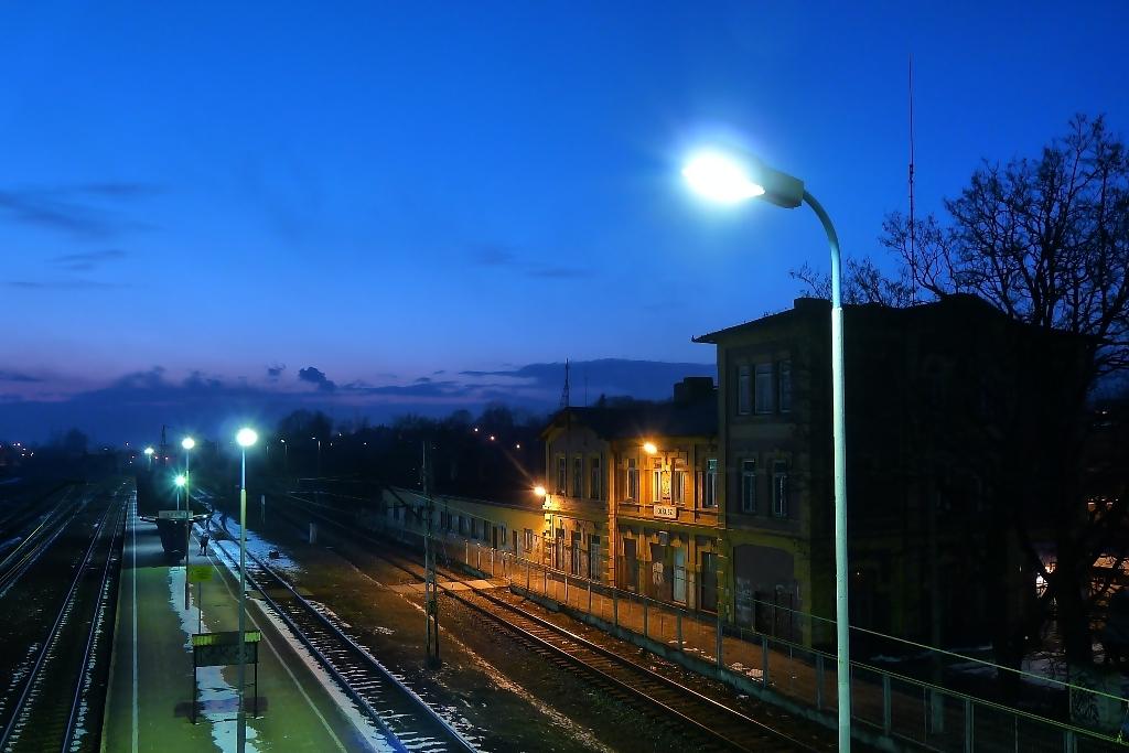 Dworzec o zmierzchu. Budynek dworca 30 min. po zachodzie słońca.