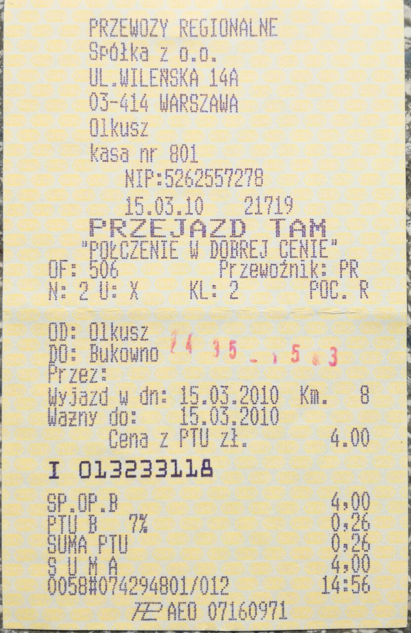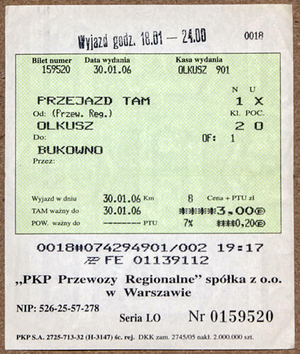 Bilet wydany w zlikwidowanej już kasie na stacji Olkusz.