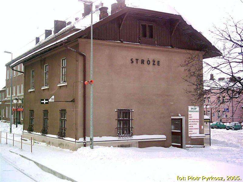 Stróże, budynek dworca od strony torów. Po lewej stronie, dobudowana do dworca nastawnia dysponująca "Sr". Widok w kierunku zachodnim; w lewo Nowy Sącz, w prawo Tarnów, Gorlice.