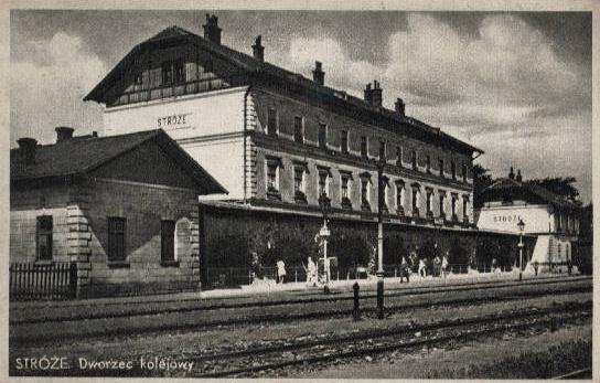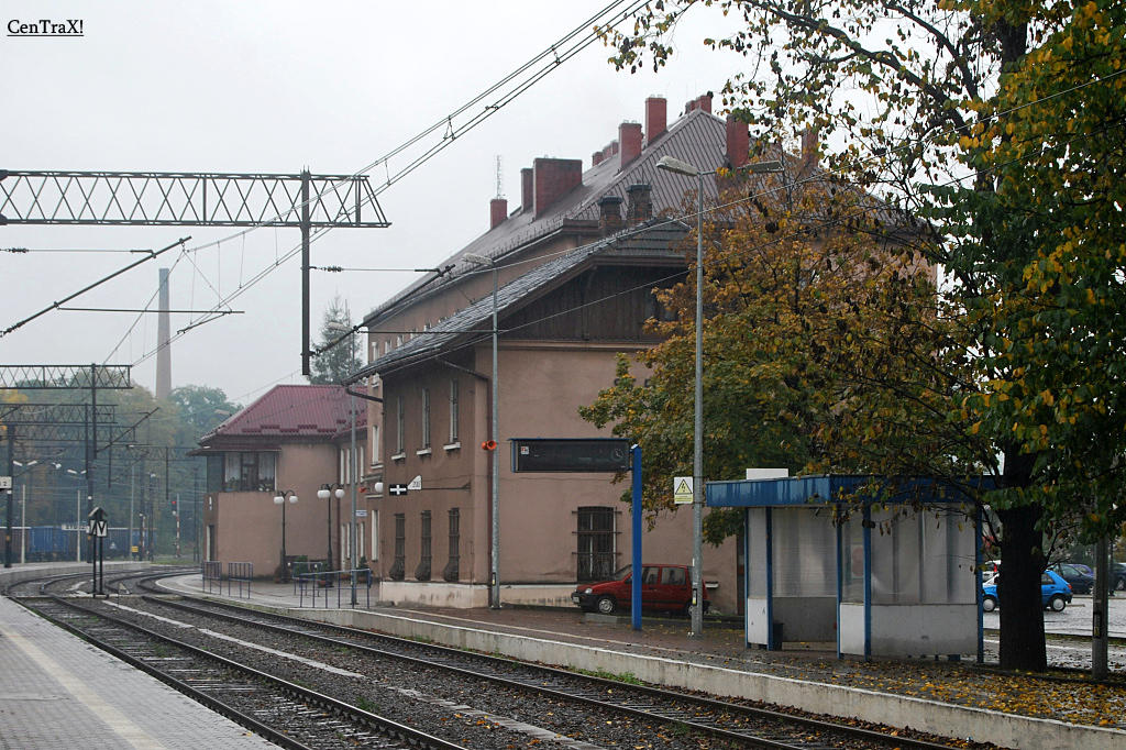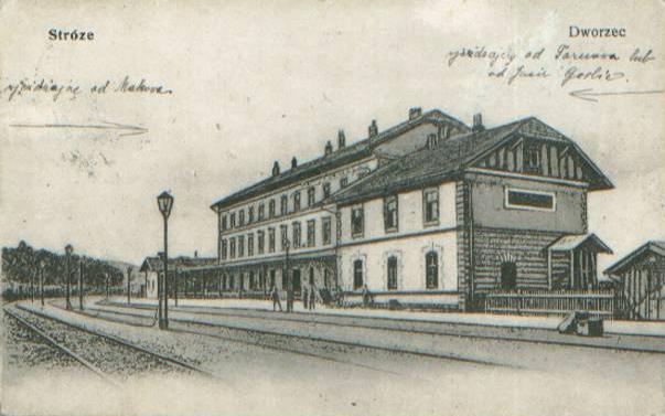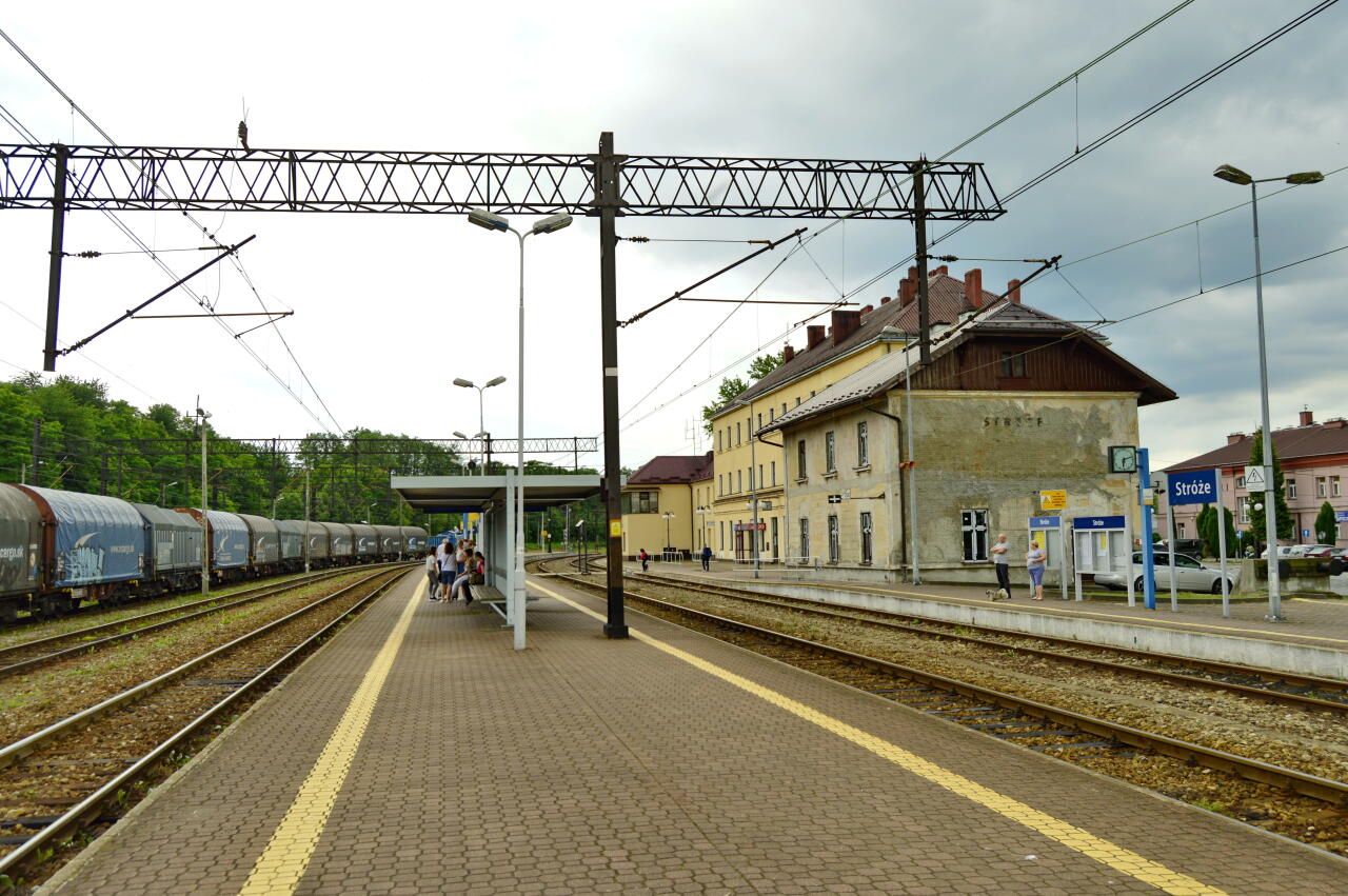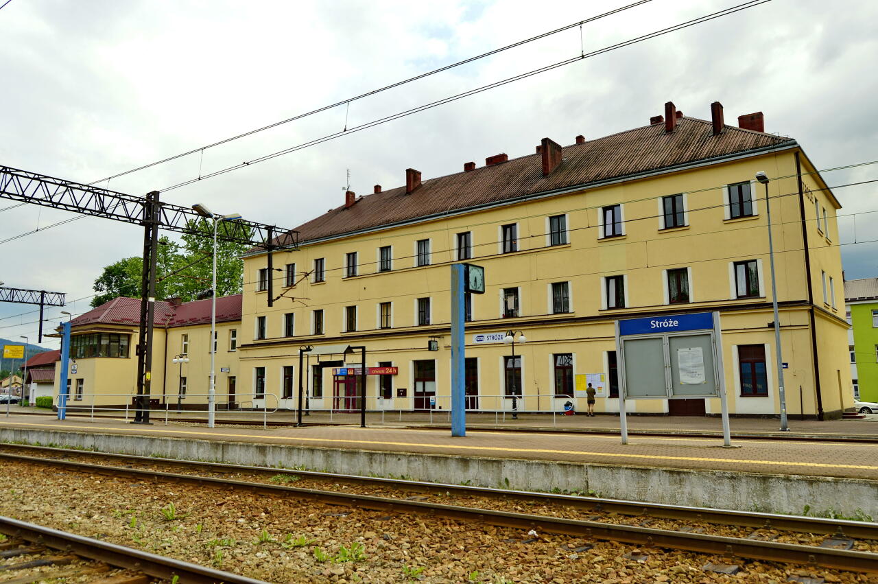 Dworzec PKP w Stróżach od strony ulicy. Widok w kierunku południowo-wschodnim.