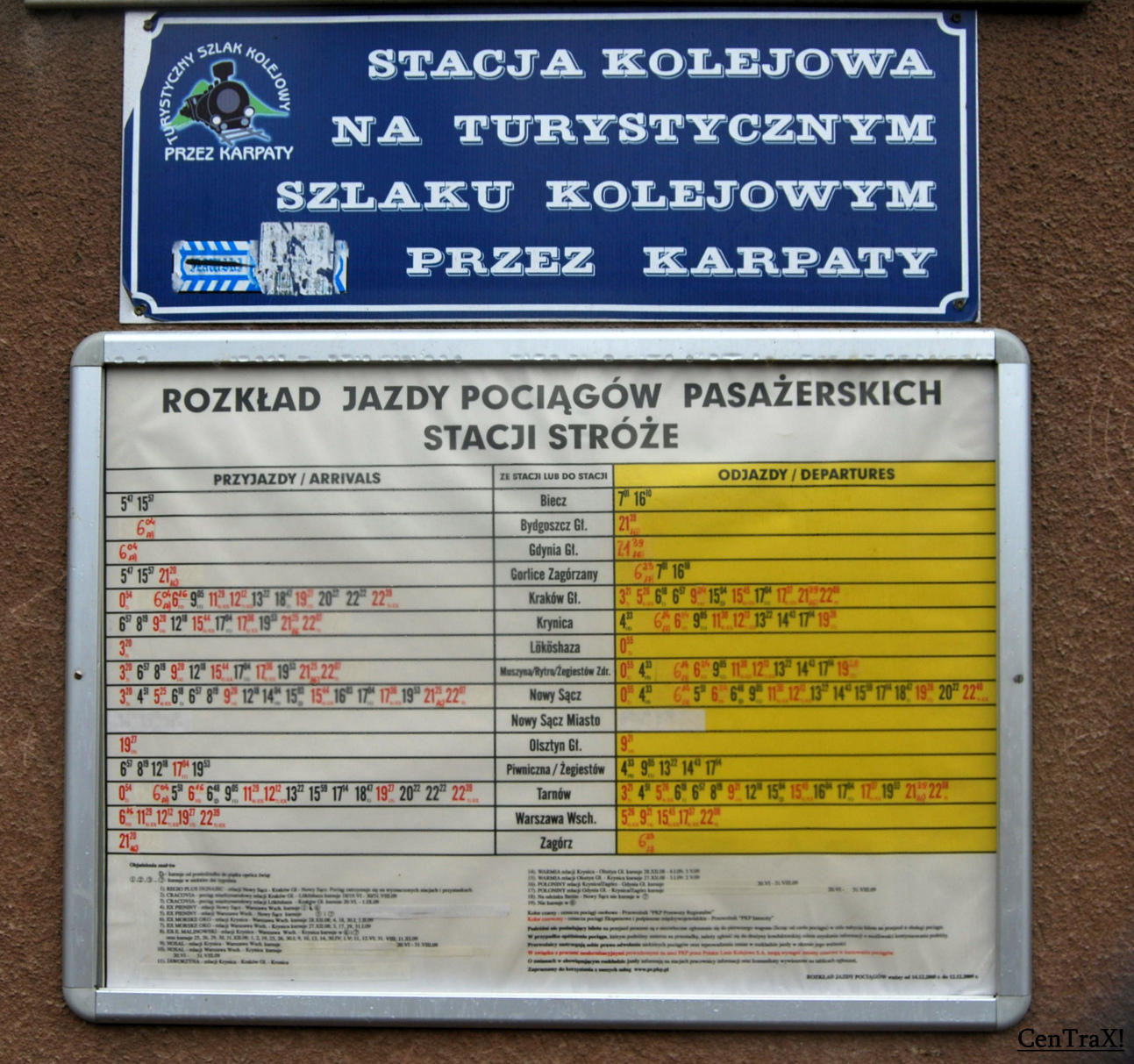 Jeździłem ze Stróż we wszystkich 3 kierunkach i o rozmaitych porach dnia i roku, a miało to wszystko miejsce tuż przed, w trakcie i tuż po elektryfikacji odcinka do Jasła, czyli w okresie od stycznia 1988 do lata 1990, a i później się zdarzało. Z tego, co pamiętam, z tego krótkiego peronu - moim zdaniem bez numeru - nic nie odjeżdżało. Perony w Stróżach były 2: II - wyspowy, z dwoma krawędziami i I - boczny, przylegający do dworca. Na żeberku raz sobie stał pług, innym razem wagony socjalne. Zresztą ono nie ma 50 metrów od ukresu do piachu.