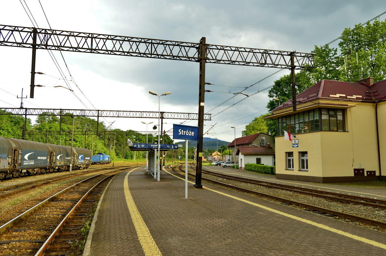 Stróże, widok z peronu 2 w kierunku Nowego Sącza (południe). Po prawej stronie budynek mieszkalny, a zanim budynek dworca.
