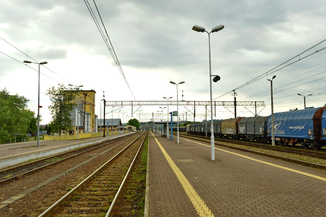 Widok na peron 1 i zabudowania stacyjne od strony wjazdów z Tarnowa i Gorlic. Z przodu piętrowy budynek mieszkalny, za nim dworzec. Kierunek południowo-zachodni.