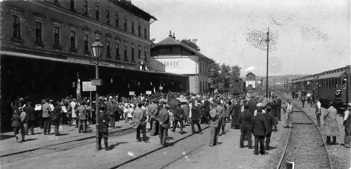 Tłumy na stacji w Stróżach w okresie międzywojennym. Widok na peron 2 w kierunku północnym, od strony wjazdu z Nowego Sącza. Z lewej peron 1, dworzec i piętrowy budynek mieszkalny.