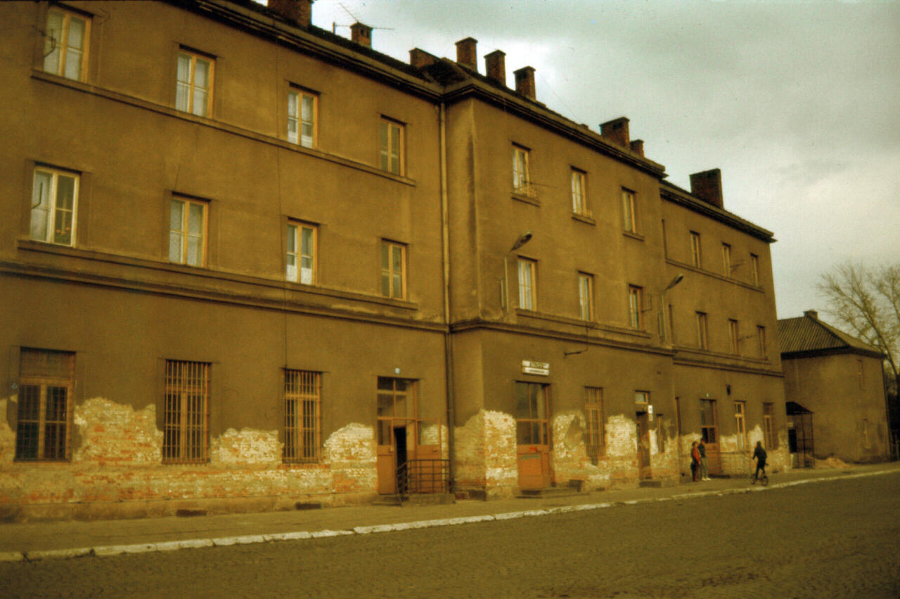 Kolejowy budynek mieszkalny. Za nim dworzec. Widok od strony peronów i wjazdów z Tarnowa i Gorlic, w kierunku południowo-zachodnim.