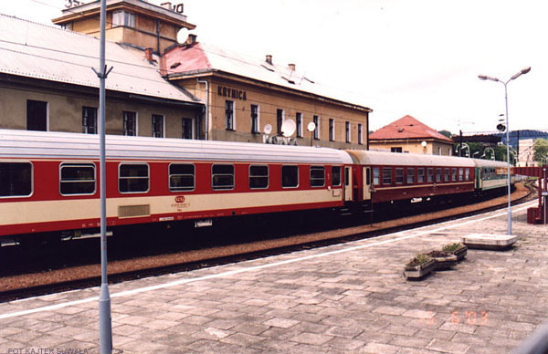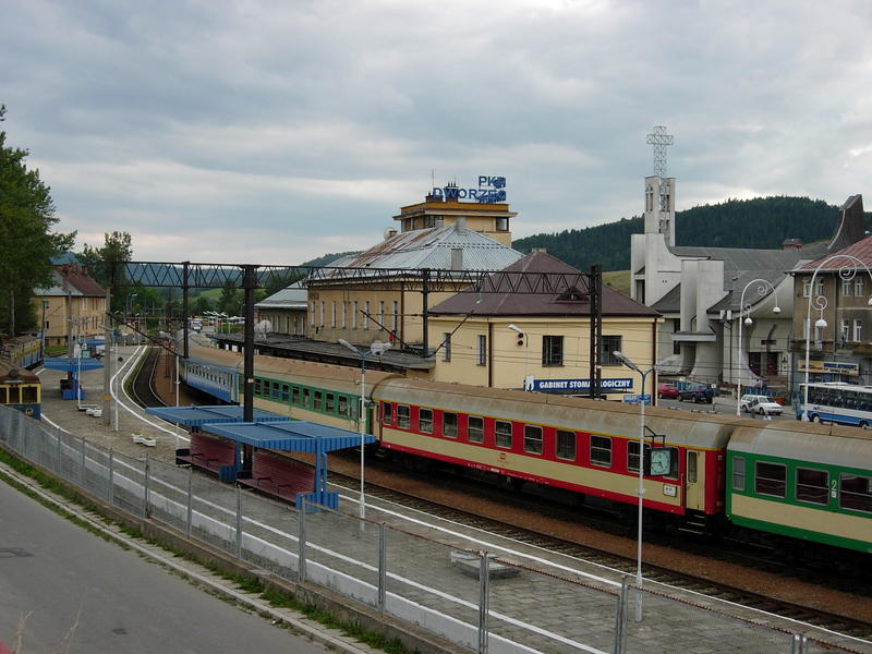 PKP Krynica. Widok dworca i pociągu z Krakowa od strony miasta.