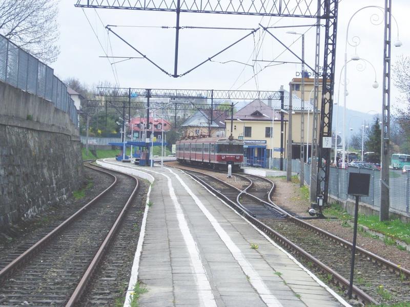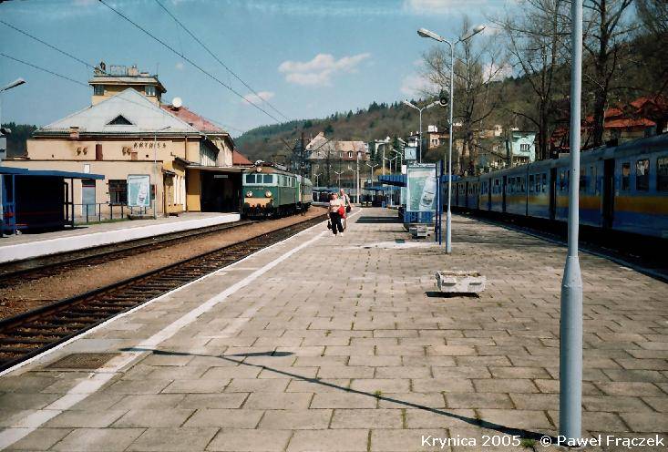 Widok z peronu nr 2 w kierunku uzdrowiskowego miasteczka. W oddali kończy się "Kryniczanka".