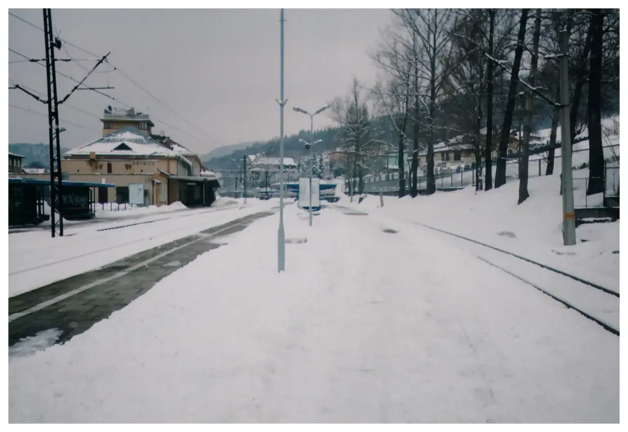 Widok w kierunku północnym: koniec linii. Z lewej budynek dworca.
