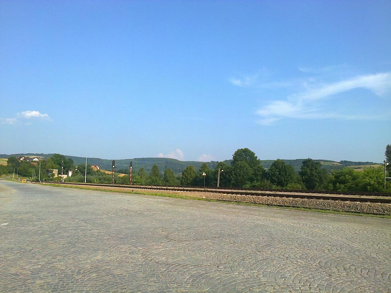 Peron oraz widoczne w oddali semafory wyjazdowe w kierunku Rzeszowa. Po prawej pociąg towarowy czekający na zwolnienie szlaku do Czudca przez pociąg osobowy.