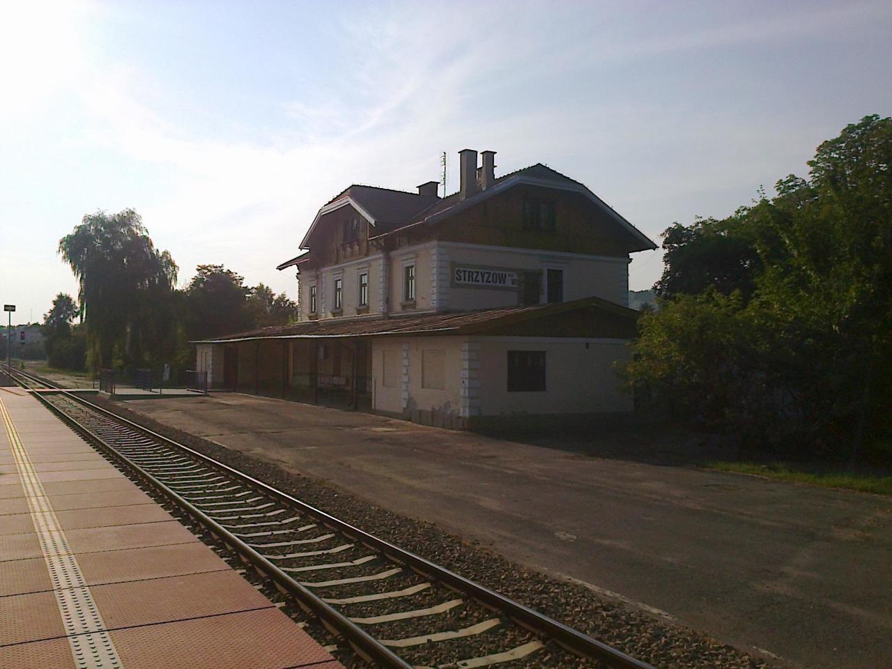 Strzyżów nad Wisłokiem - budynek dworca widziany z peronu i wjazdu z Rzeszowa.