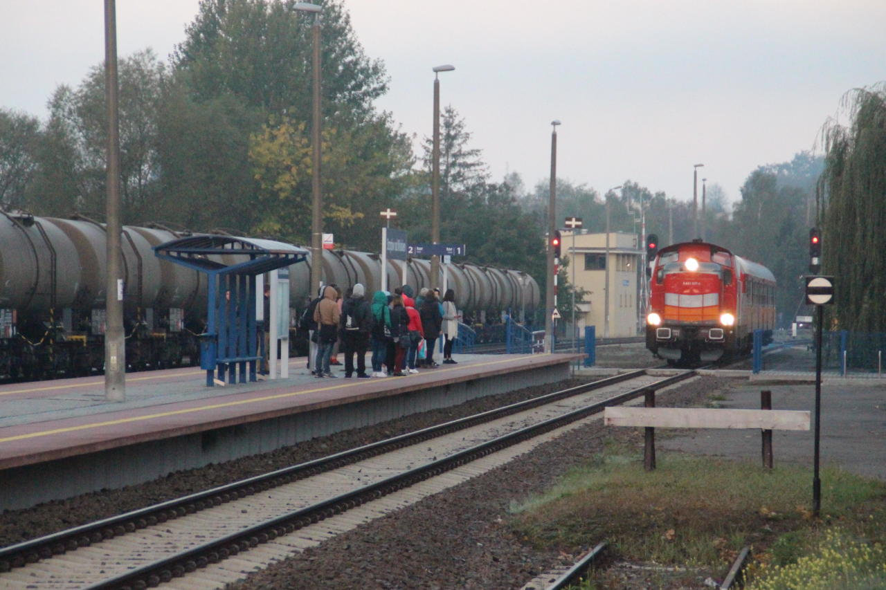 Peron oraz wjeżdżający "szkolny" pociąg osobowy do Rzeszowa. Na pierwszym planie widać również zakończenie toru położonego przy placu ładunkowym (sądząc po stanie rampy, raczej nieużywanego). W tle nastawnia dysponująca St.