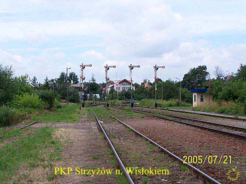 Strzyżów nad Wisłokiem - widok w kierunku Rzeszowa. Plac ładunkowy. Widoczne semafory wyjazdowe i nastawnia wykonawcza ST1 (z lewej).