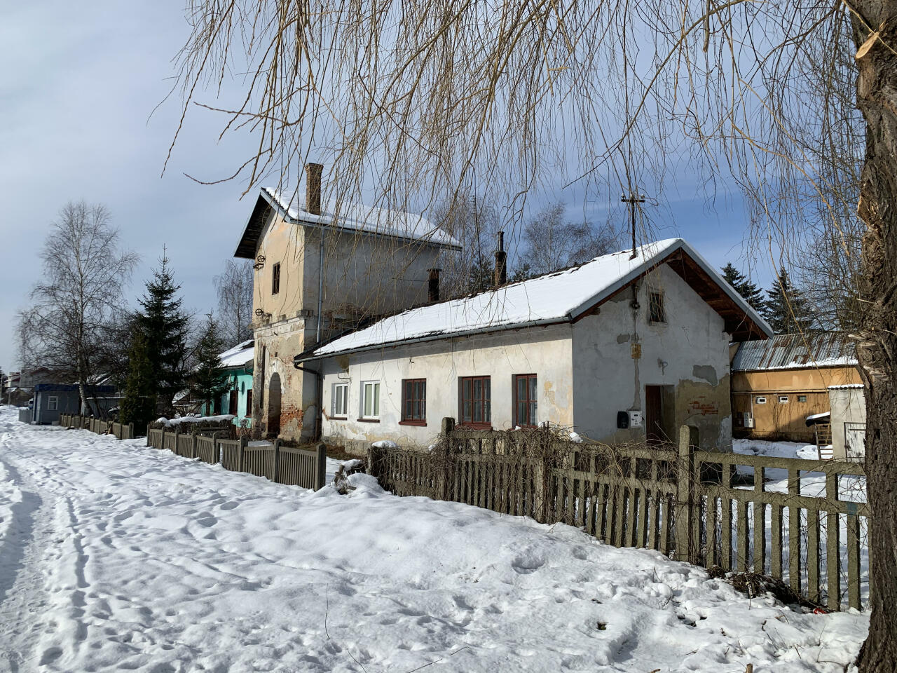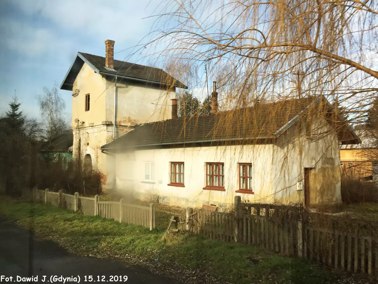 Kolejowy budynek mieszkalny z przyległą wieżą wodną widoczny od strony torów. Obiekt znajduje się po lewej stronie budynku dworcowego. W lewo Jasło, w prawo dworzec i peron, dalej Boguchwała/Rzeszów Główny.
