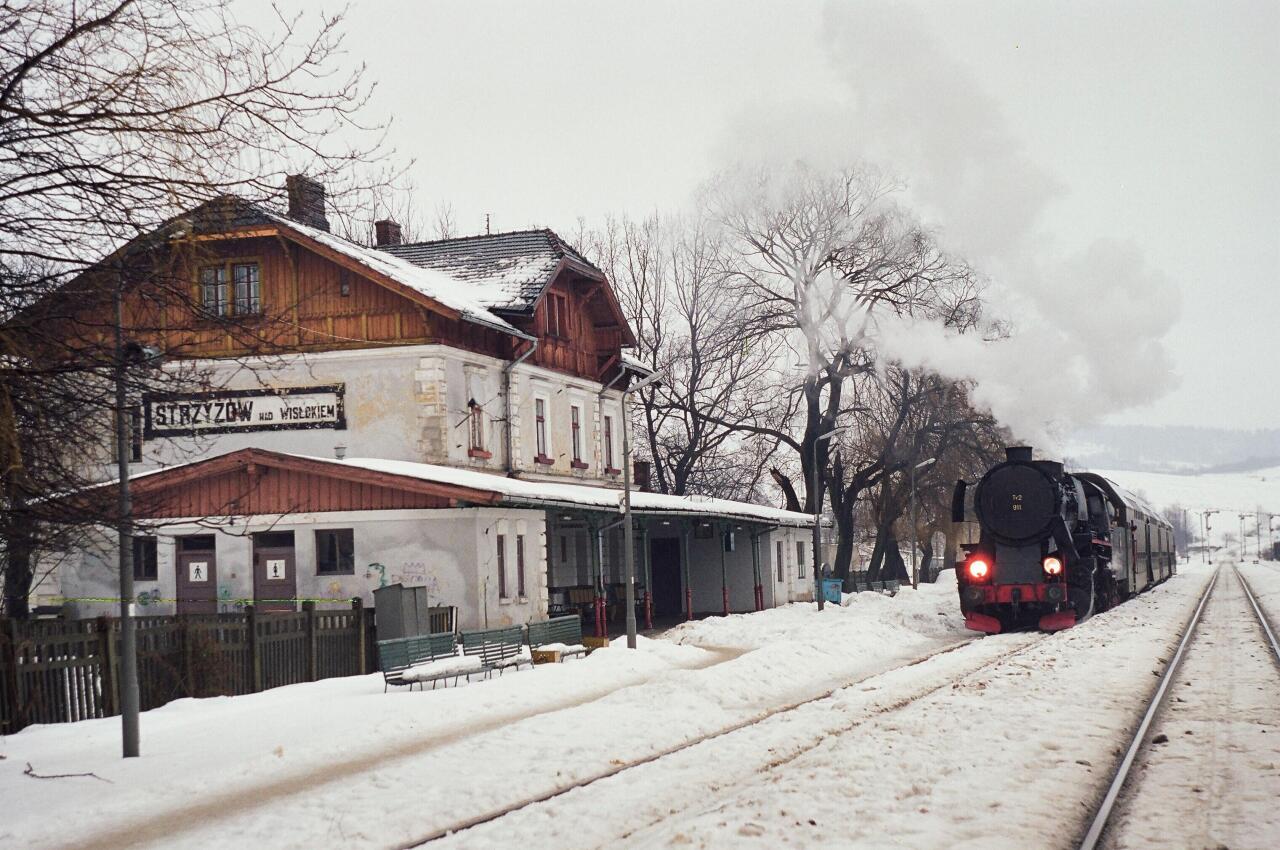 Dworzec w Strzyżowie zimą. Z lewej peron. Widok w kierunku Jasła.