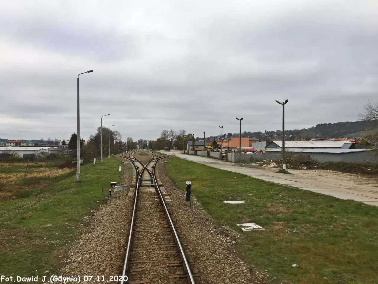 Widok na koniec peronu i w kierunku Jasła. Budynek dworcowy znajduje się po prawej stronie.