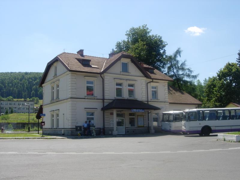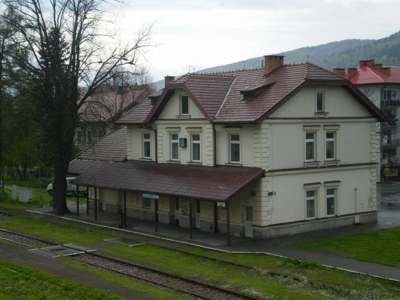 Budynek dworca PKP Ustrzyki Dln. Pomimo, że taki napis widnieje nad wejściem, to jest to dzisiaj dworzec nie kolejowy, ale autobusowy… Widok od strony podjazdu; w lewo Krościenko, w prawo Zagórz.