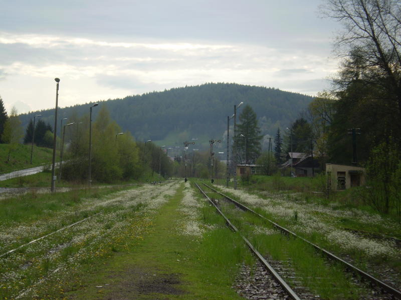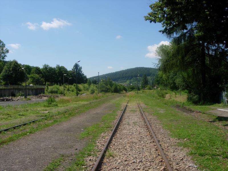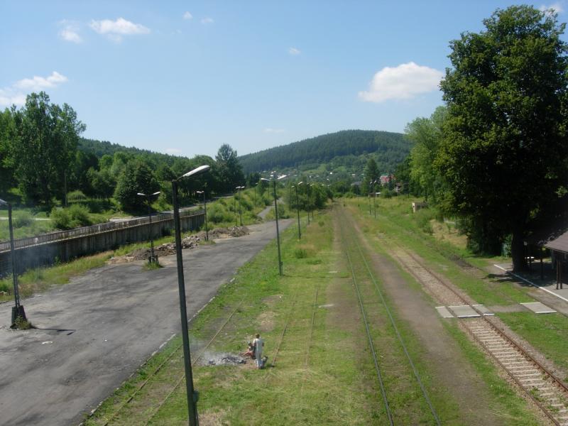 Widok z kładki w kierunku Zagórza. Z prawej, poza kadrem, budynek dworca. Z lewej plac przeładunkowy.
