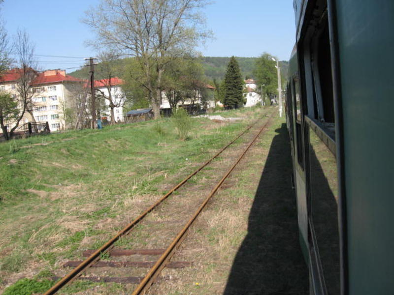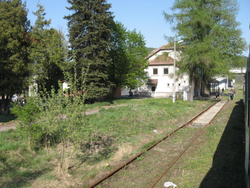 Widok z kładki na odjeżdżający pociąg z ukraińskiego Chyrowa do Sanoka. Z prawej budynek dworca. Widok w kierunku Zagórza/Sanoka.