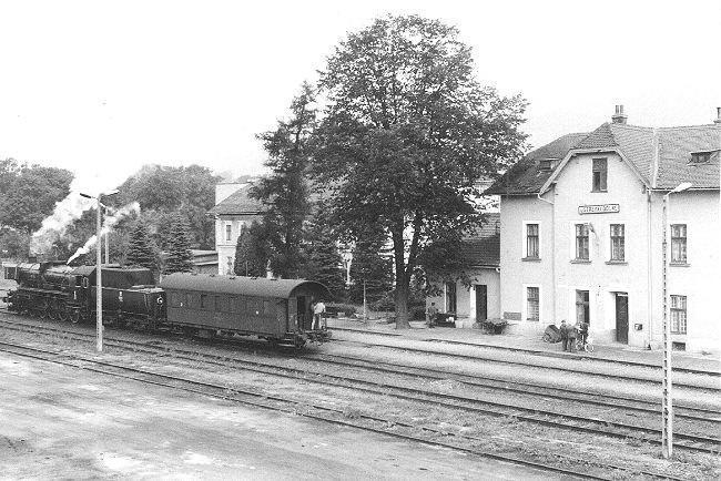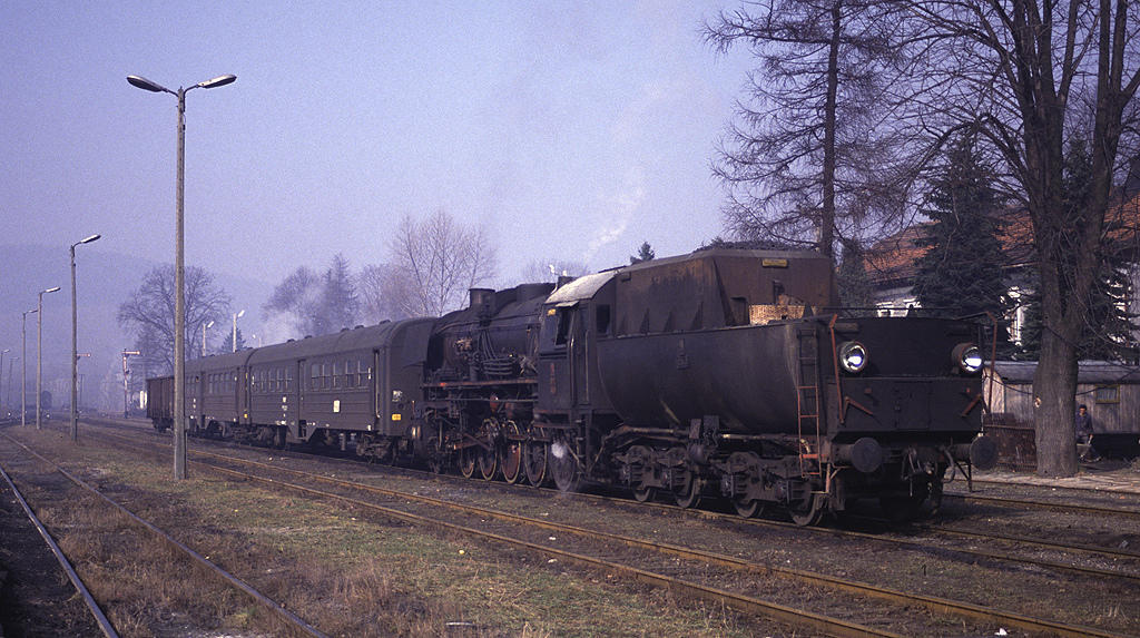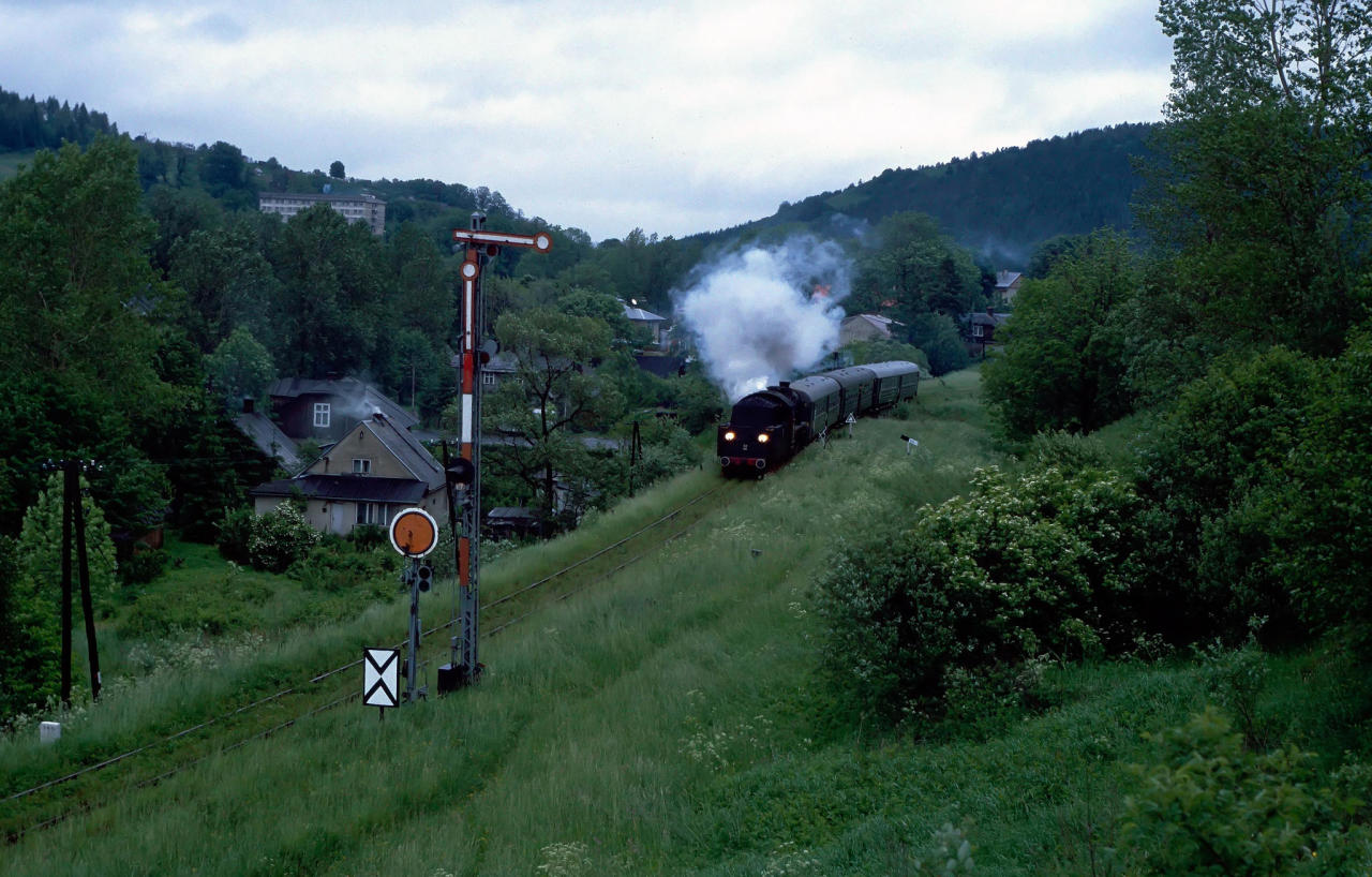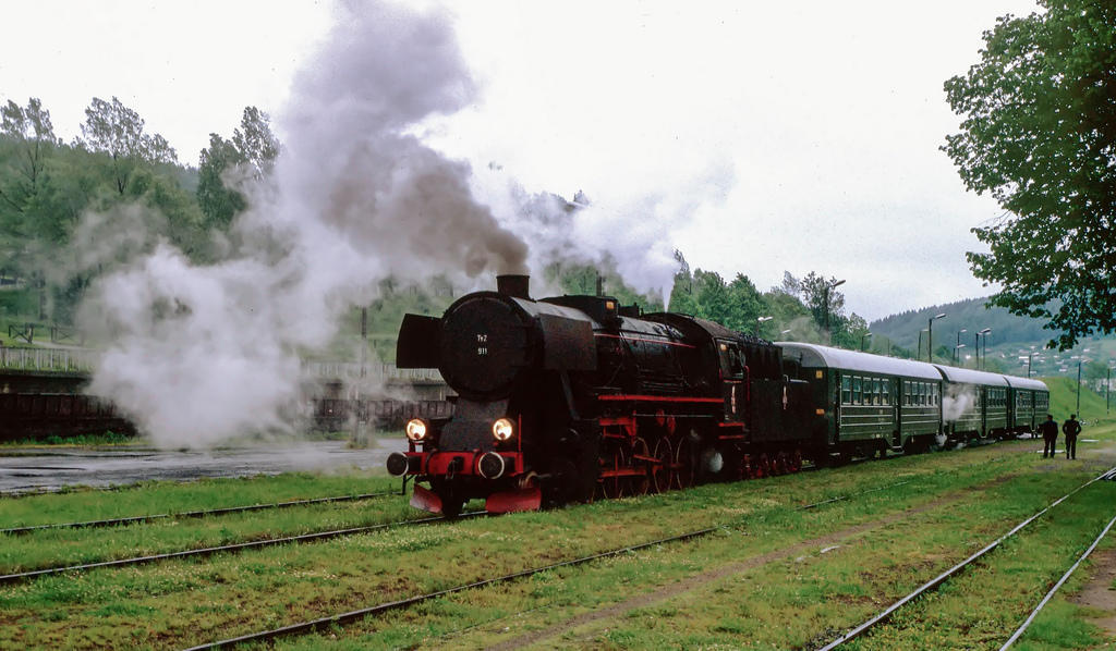 Pociąg specjalny z Ty2 na czele opuszcza stację w Ustrzykach Dolnych. Na pierwszym planie semafor wjazdowy od strony Zagórza. Widok w kierunku wschodnim.
