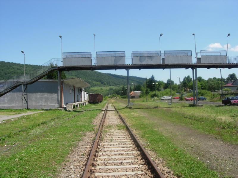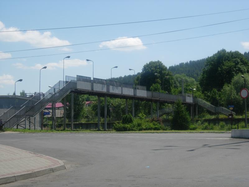 Ustrzycka kładka nad torami. Widok od strony ul. Dworcowej. Z prawej, poza kadrem, dworzec. W lewo wyjazd do Krościenka.