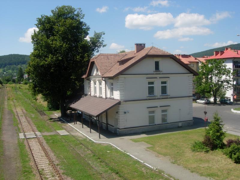 Budynek dworca od strony peronów i wjazdu z Krościenka. Aktualnie jest to budynek dworca autobusowego. Zdjęcie wykonane z kładki nad torami.