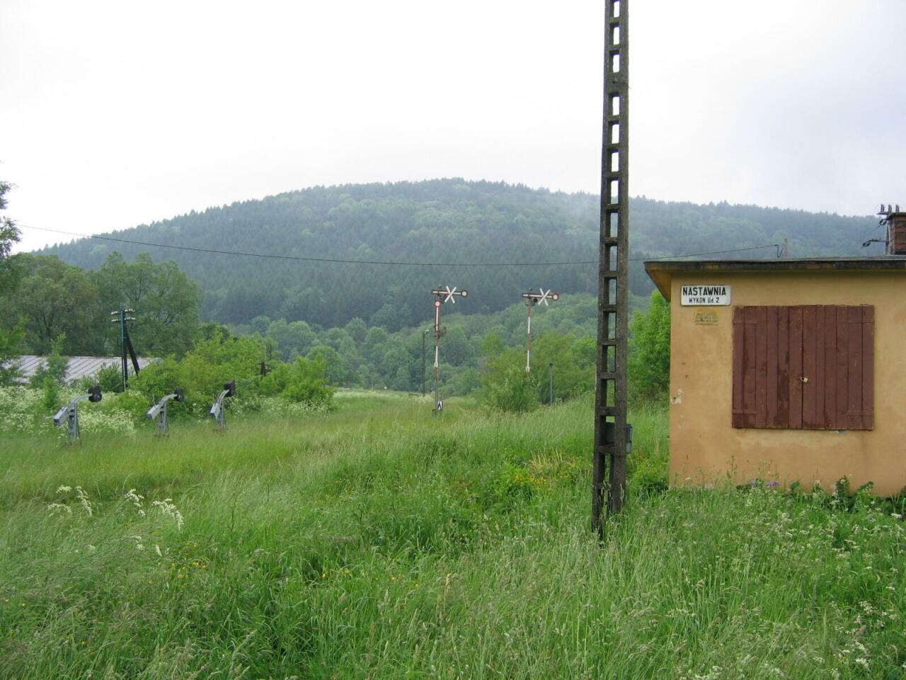 Unieważnione semafory wyjazdowe w kierunku Zagórza. W tle nastawnia wykonawcza.