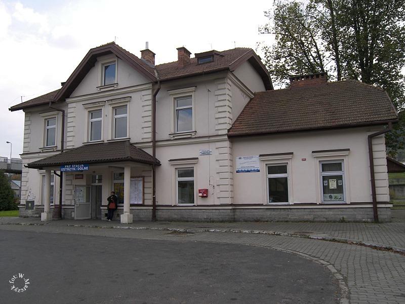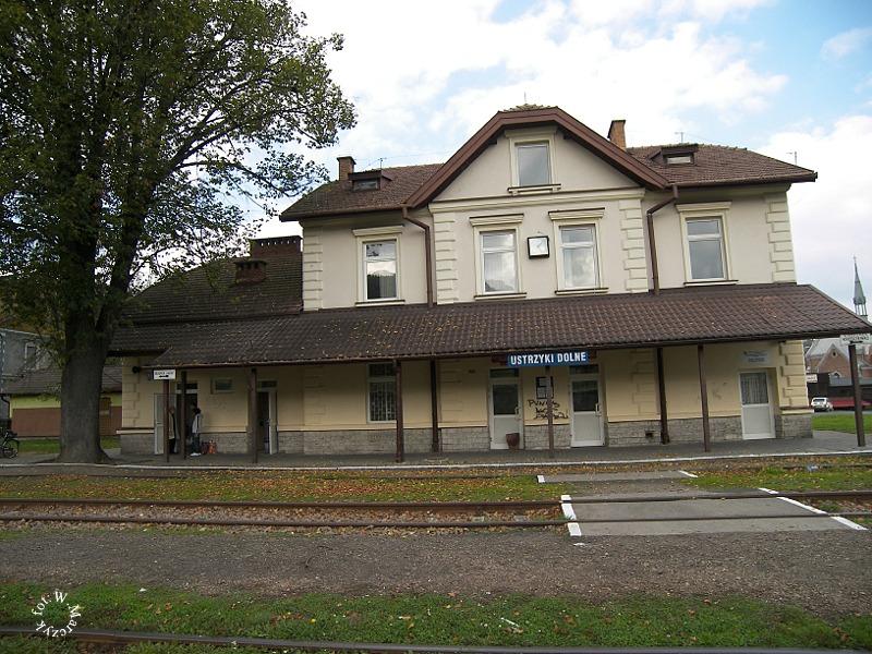 Budynki stacyjne w Ustrzykach Dolnych, położone po przeciwnej stronie torów, co dworzec (z prawej, poza kadrem). W tle widoczna kładka nad torami. Widok od strony wjazdu z Krościenka.
