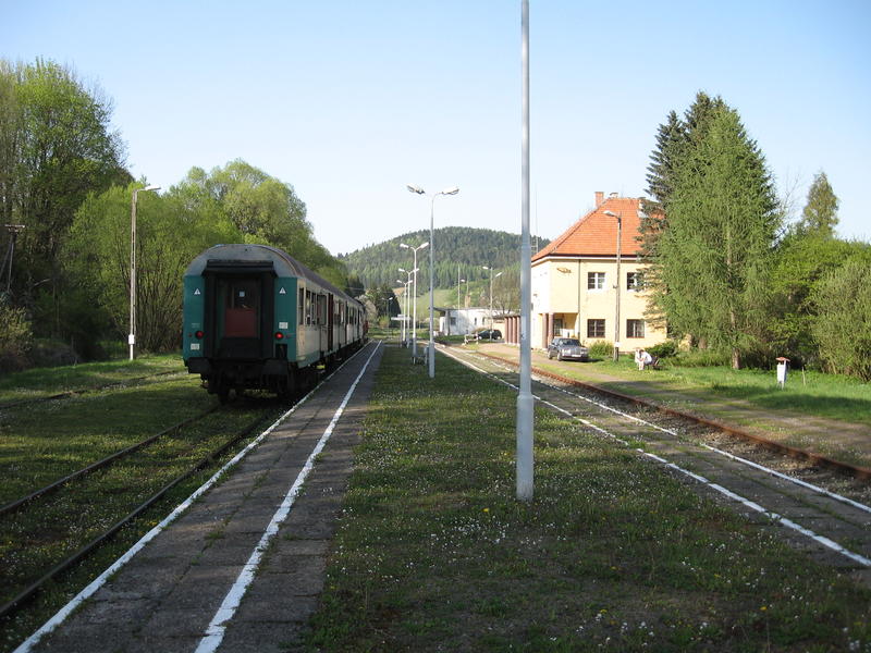 Krościenko. Zachwycony prawie 2,5 godzinną podróżą z Sanoka opuszczam pociąg, który miejscami osiągał zawrotną prędkość 15 km/h wg wskazań Nawigacji GPS. Widok w kierunku Chyrowa.