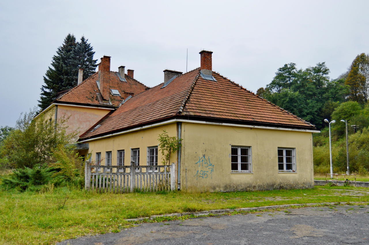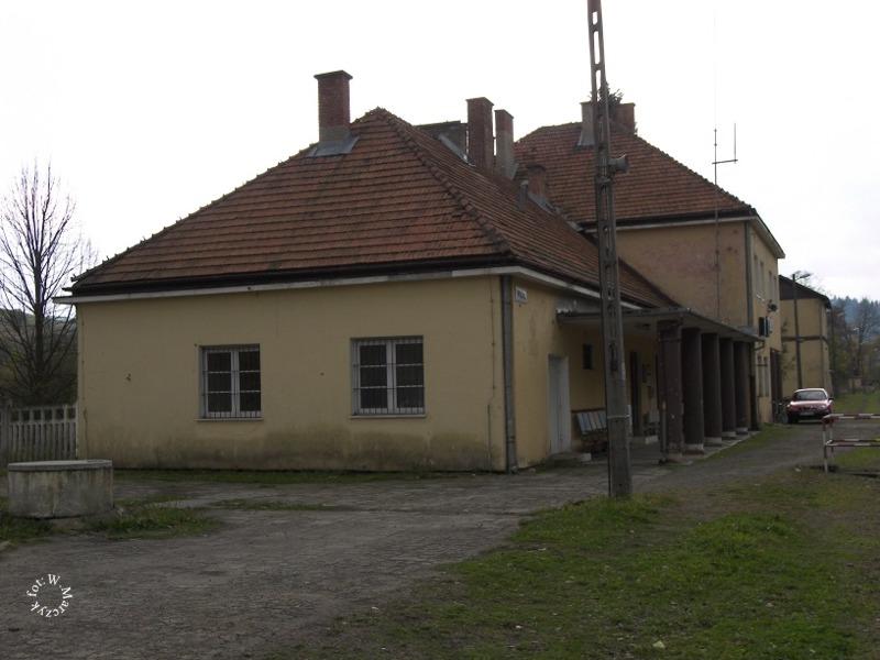 Budynek dworca - ściana szczytowa. Z prawej peron. Widok od strony Chyrowa.