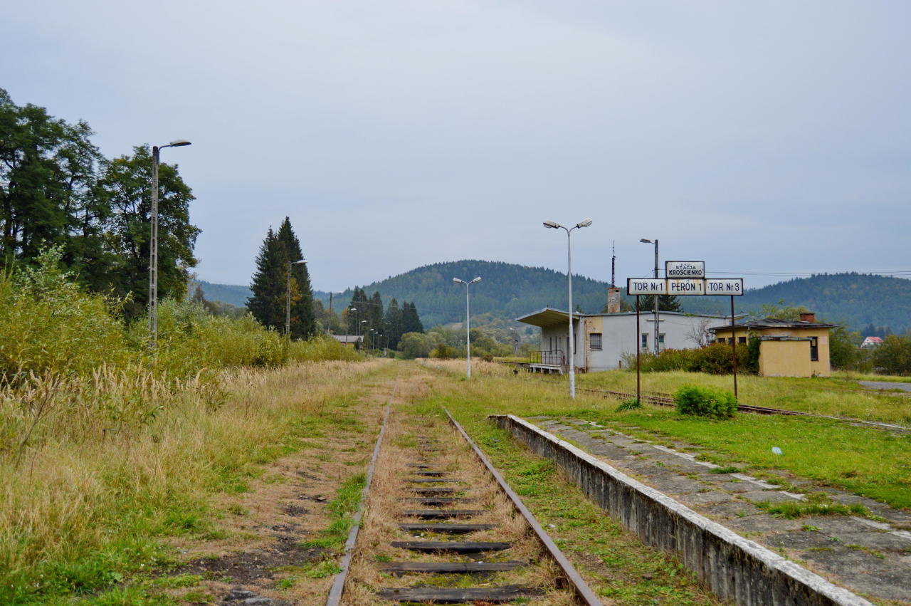 Dworzec PKP Krościenko. Widok od strony peronu; w prawo Ustrzyki Dolne/Zagórz, w lewo Chyrów.