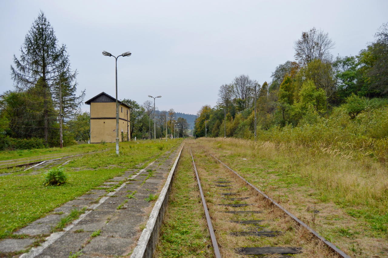 Peron w stacji Krościenko. Z lewej wieża wodna. Widok w kierunku Ustrzyk Dolnych/Zagórza.
