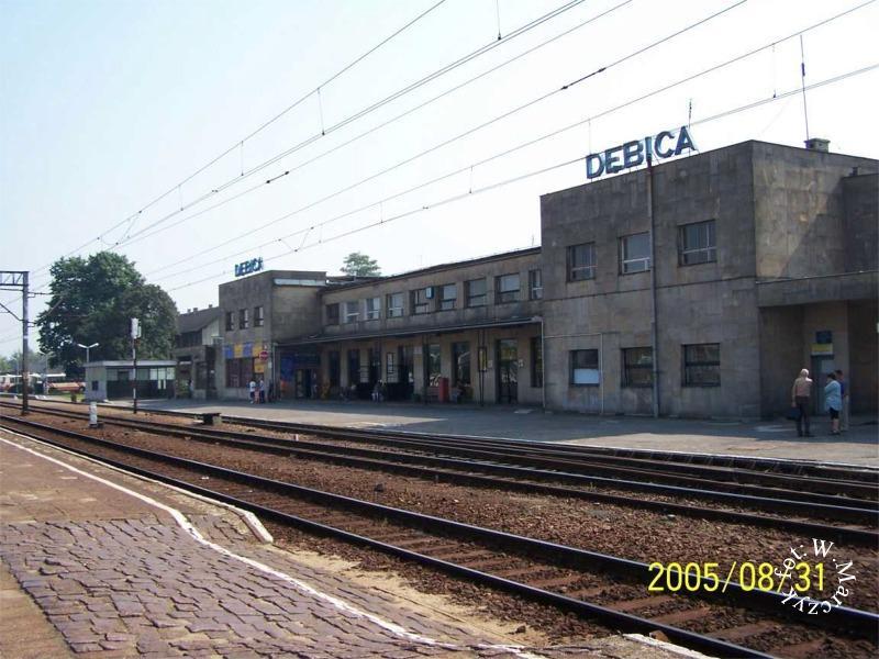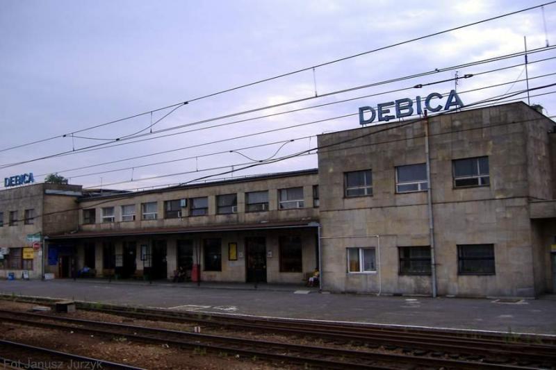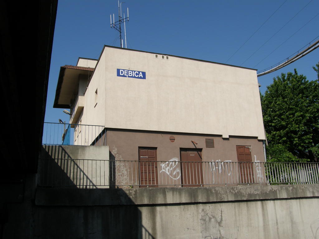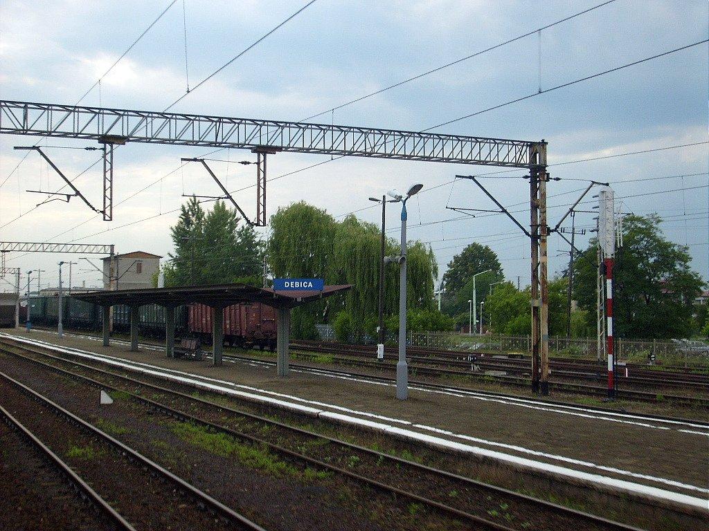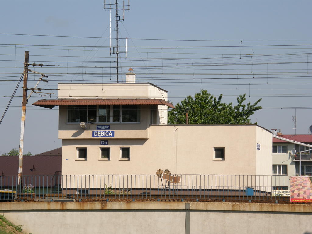 Nastawnia bocznicy Zakładów Oponiarskich Dębica z napisem T.C. Dębica. 109,9 km. W lewo Rzeszów, w prawo Tarnów.