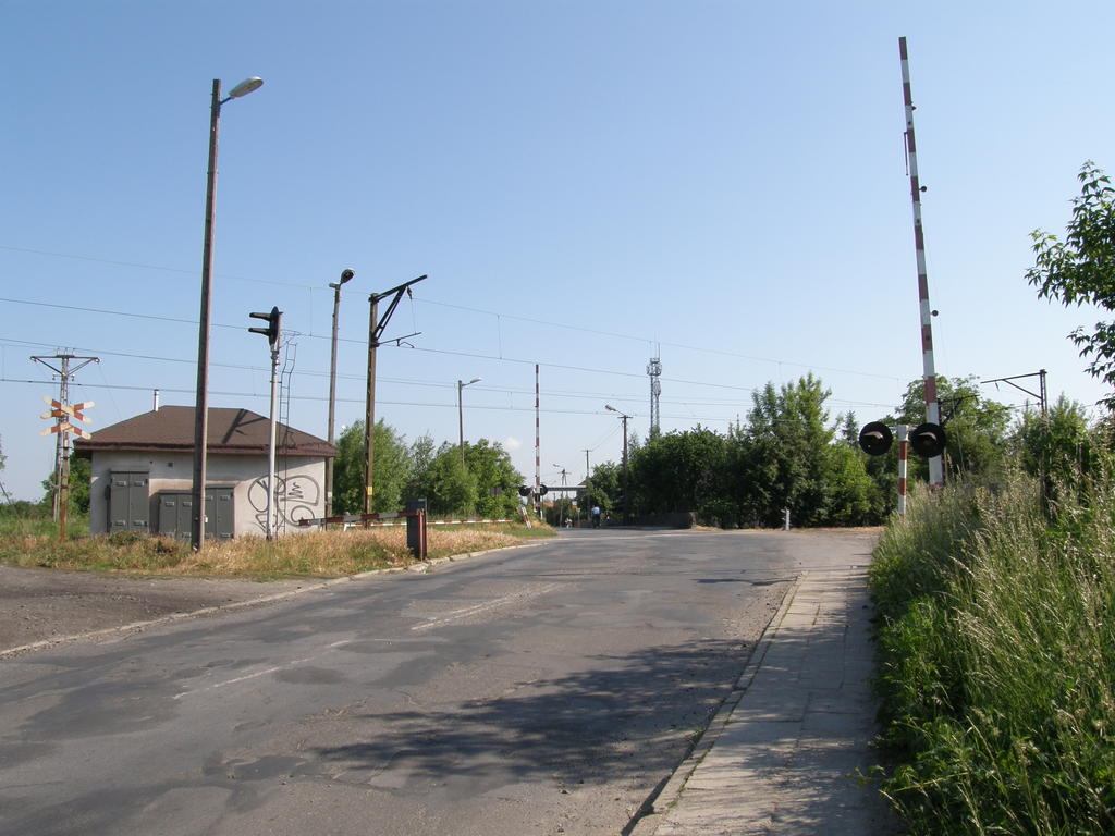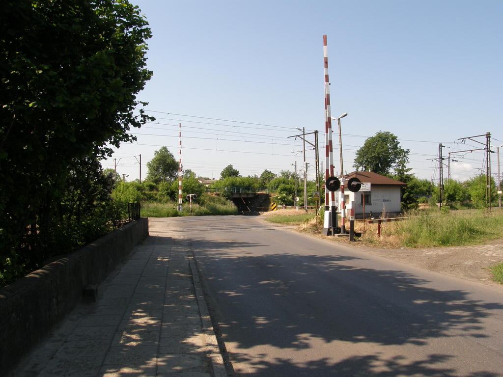 Przejazd drogowy w ciągu ulicy Świętosława na torze z lokomotywowni Dębica do stacji Dębica Towarowa. Widok w stronę Tarnobrzega i Dębicy Towarowej.