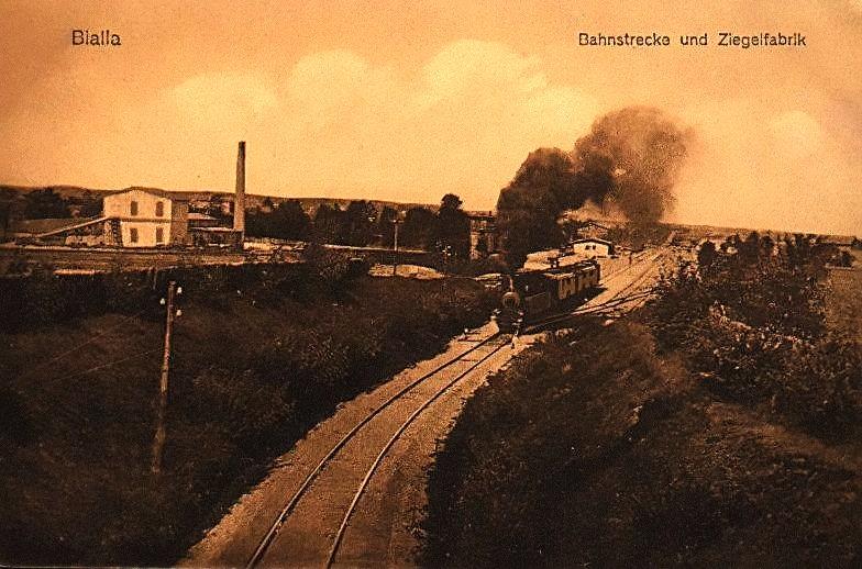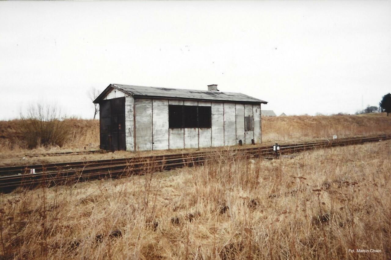 Stacja Biała k. Piszu (Biała Piska), widoczna nieistniejąca mała jednostanowiskowa lokomotywownia na końcu równi stacyjnej przy wyjeździe od strony Drygał (Ełku). Przed 1945 rokiem stacjonowała w niej mała lokomotywa spalinowa wykorzystywana do manewrów na stacji i bocznicach, w latach 80 XX wieku drezyna spalinowa (nie wiem czy była tam na stałe), później drezyna ręczna i/lub wózek szynowy. W trawie w prawym dolnym rogu widoczne dwa tory - punkt zdawczo odbiorczy bocznic do Agromy (?) i elewatora.