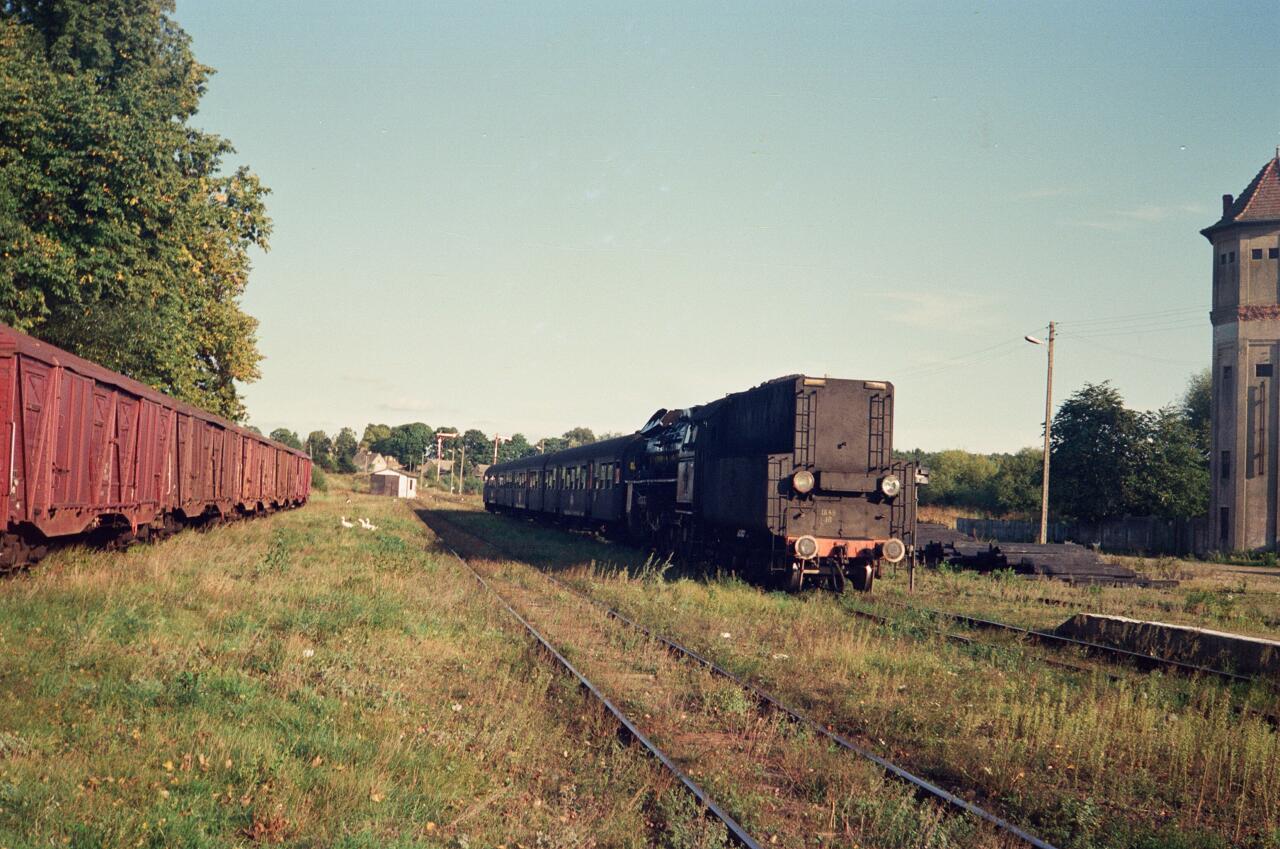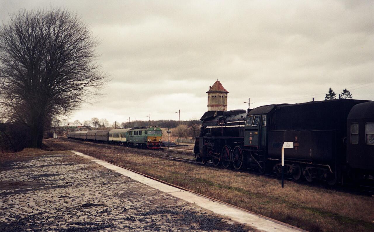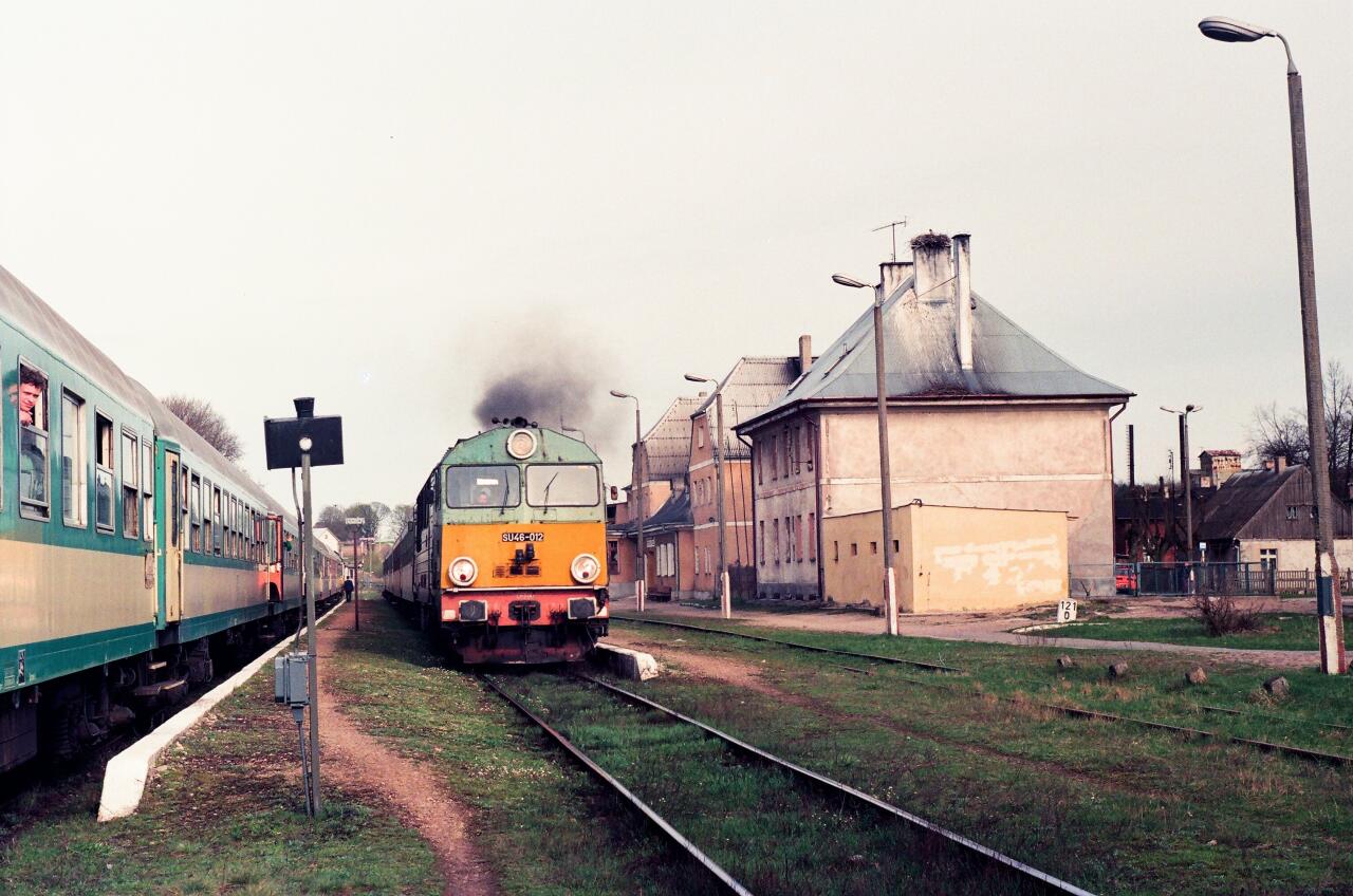 Krzyżowanie pociągów do i z Ełku tuż po wprowadzeniu drastycznego obniżenia prędkości na tej linii. Na pierwszym planie SU46-012. Widok w kierunku wschodnim (Ełk).